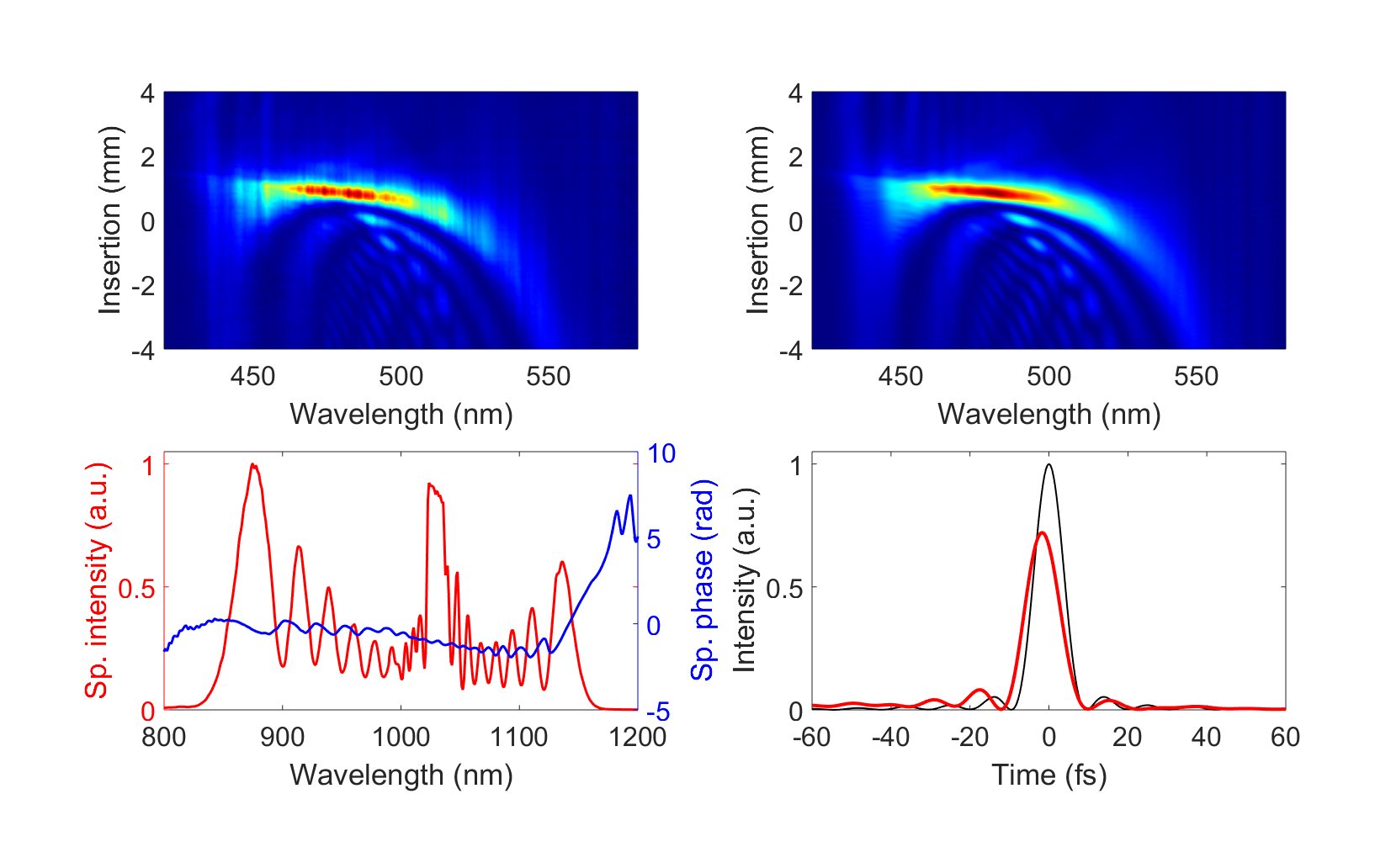 Vollständige Charakterisierung der 10 fs-NIR-Impulse durch eine Dispersions-Scan-Messung. Dabei wird zunächst die spektrale Phase der Impulse variiert (Chirpen), indem Glas mit allmählich zunehmender Dicke in den Strahl eingebracht wird. Dann wird in einem dünnen nichtlinearen Kristall die zweite Harmonische der gechirpten Impulse erzeugt und ihr Spektrum als Funktion verschiedener Glasdicken aufgezeichnet. Auf diese Weise wird eine zweidimensionale Kurve aufgezeichnet (dargestellt im oberen linken Fenster), aus der die fehlenden Phaseninformationen mit Hilfe eines iterativen numerischen Algorithmus extrahiert werden können. Die durch den Phasenabrufalgorithmus simulierte Kurve wird im oberen rechten Feld dargestellt und weist eine gute Ähnlichkeit mit der gemessenen Kurve auf. Das gemessene Spektrum des Impulses zusammen mit der rekonstruierten Phase wird im unteren linken Feld angezeigt, während ihre Fourier-Transformation, die die Pulsform (rote Kurve) ergibt, unten rechts angezeigt wird. Die schwarze Kurve in diesem Feld entspricht dem kürzestmöglichen Impuls für das gemessene Spektrum.
