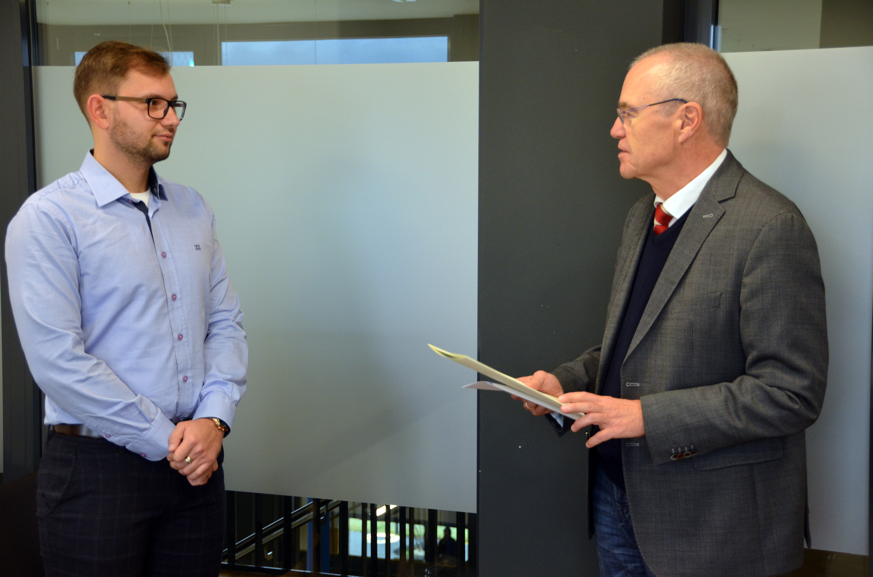 An der Hochschule Landshut erhält dieses Jahr Dmytro Borodin den DAAD-Preis. Die Urkunde überreichte Prof. Dr. Deltev Maurer, Vizepräsident Diversität und Internationalisierung der Hochschule Landshut. Maurer hob die exzellenten Leistungen von Borodin hervor: „Sie haben hervorragende Noten, sind fachlich überaus engagiert und ein kritisch reflektierender, wissenschaftlich sehr interessierter Student.“ Maurer lobte darüber hinaus Borodins interkulturelles und sozial-gesellschaftliches Engagement. Der 29-Jährige Ukrainer studiert im fünften Semester Soziale Arbeit und absolviert derzeit sein Praxissemester im Haus International an der Gemeinschaftsunterkunft in der Niedermayerstraße.