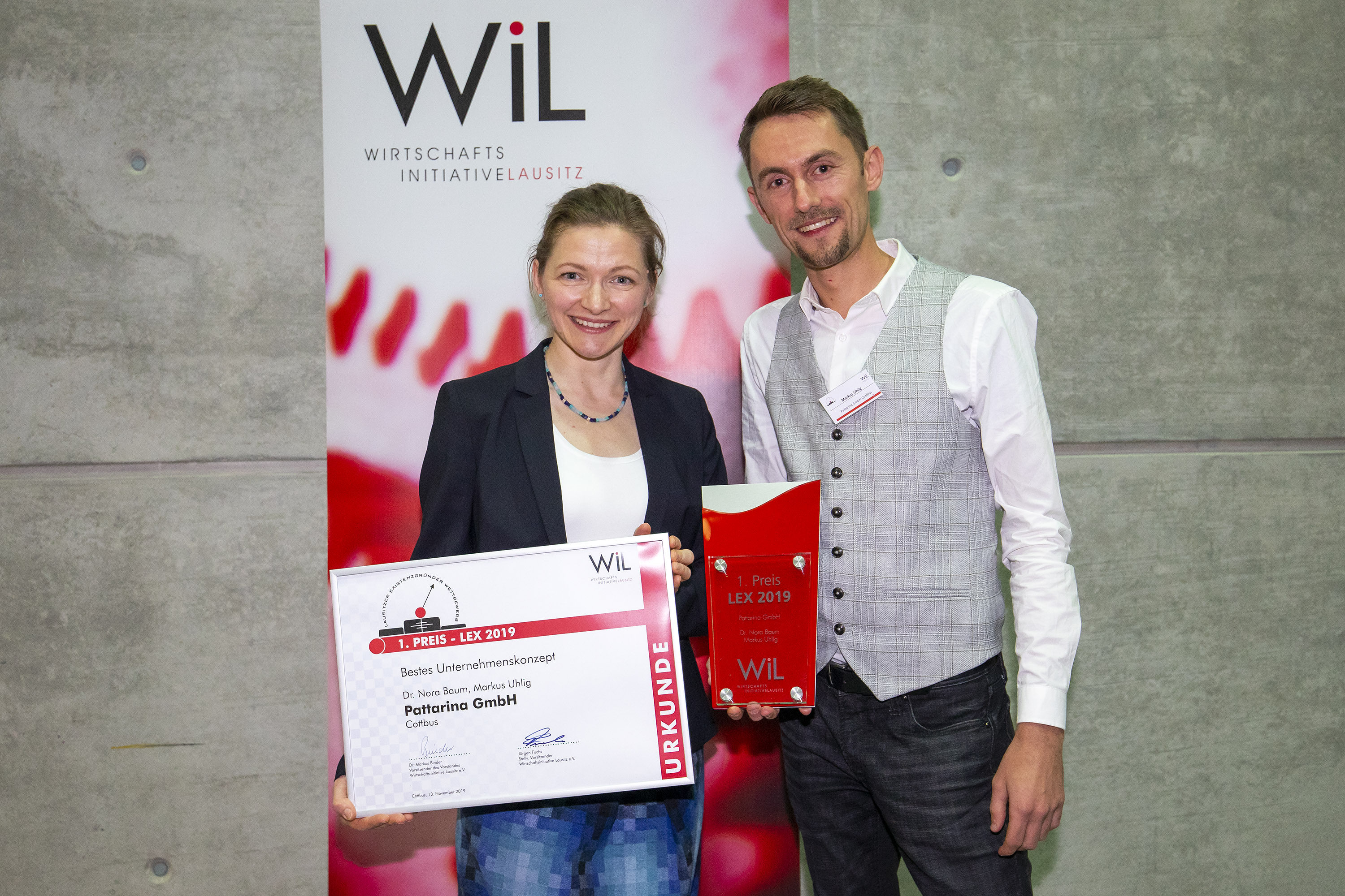 Der mit 5.000 € dotierte erste Preis in der Kategorie "bestes Unternehmenskonzept" ging an die BTU-Ausgründung Pattarina GmbH von Dr. Nora Baum und Markus Uhlig. Das Unternehmen hat eine App entwickelt, mit der Schnittteile im Handybildschirm, mit Hilfe von Augmented Reality, präzise angezeigt und direkt auf den Stoff übertragen werden können. Die App dient dazu, Aufwand und Zeit zu sparen und sich eine bessere Übersicht über die Schnittmuster und Nähprojekte zu behalten. Dr. Markus Binder, Vorsitzender der WiL und LEX-Juryvorsitzender sagt über den ersten Platz: „Unsere Preisträger sind Menschen, die nichts dem Zufall überlassen und analytisch, zielorientiert und rational die Dinge angehen. Bei ihrer Präsentation in der Jurysitzung zeichneten sie sich durch ihre Energie und leidenschaftliche Präsentation ihrer Geschäftsidee aus. Mit ihrem Konzept, ihrer Professionalität und ihrer Leidenschaft haben sie uns überzeugt. Insgesamt sind alle Bewerber bestens aufgestellt, mit ihrem Geschäft die Zukunft in der Lausitz zu gestalten. Wir wünschen allen Preisträgern, den Nominierten und Teilnehmern viel Erfolg bei der Umsetzung ihrer Geschäftsidee und stehen als Wirtschaftsinitiative Lausitz gerne auch weiterhin an ihrer Seite.“