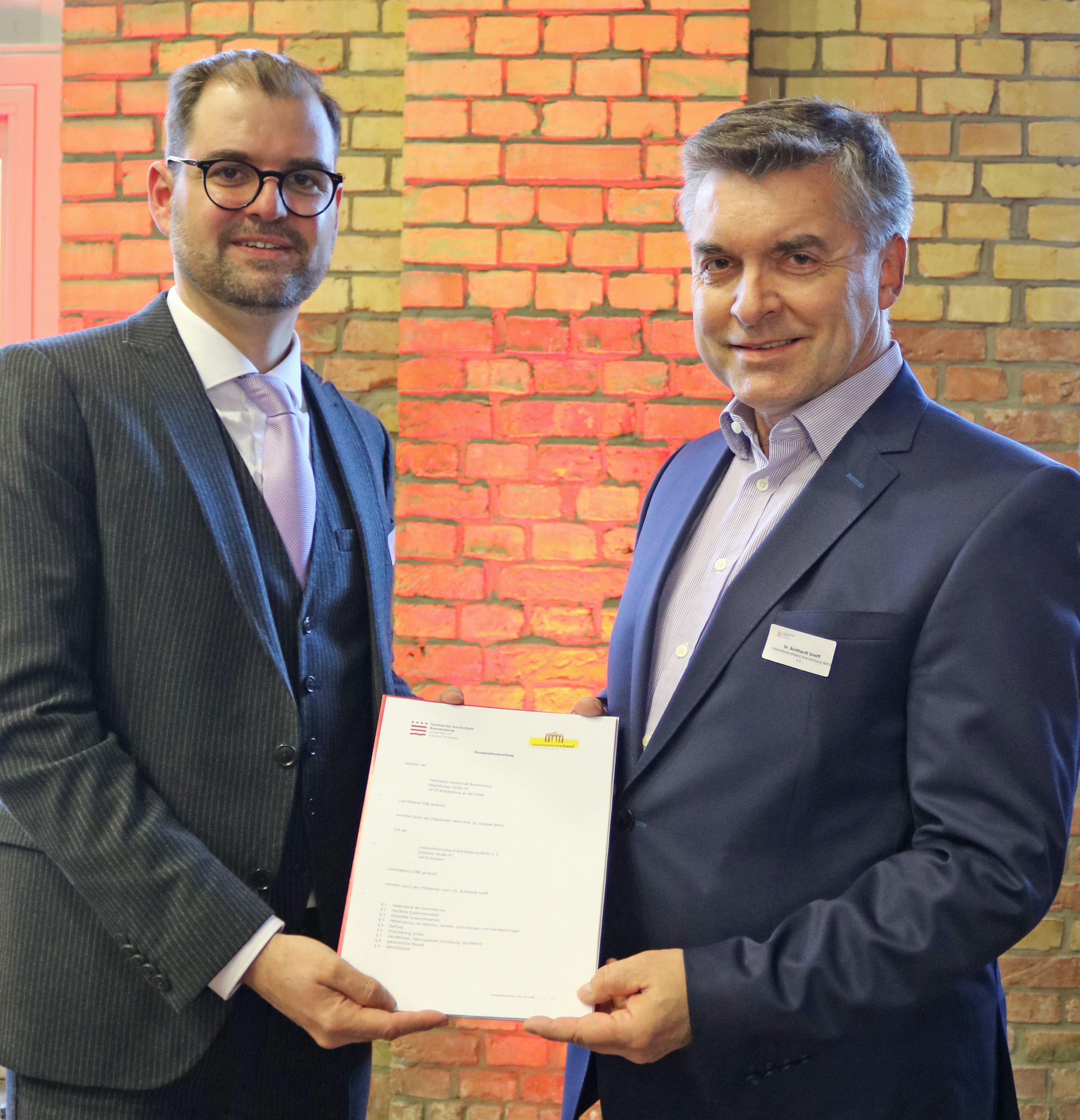 Der Unternehmerverband Brandenburg-Berlin e. V. (UVBB) und die Technische Hochschule Brandenburg (THB) wollen enger zusammenarbeiten. Dazu haben Dr. Burkhardt Greiff als Präsident des UVBB und Prof. Dr. Andreas Wilms als Präsident der THB am gestrigen Donnerstag im Rahmen des Technologie.Transfer.Tags der THB einen Kooperationsvertrag unterzeichnet.