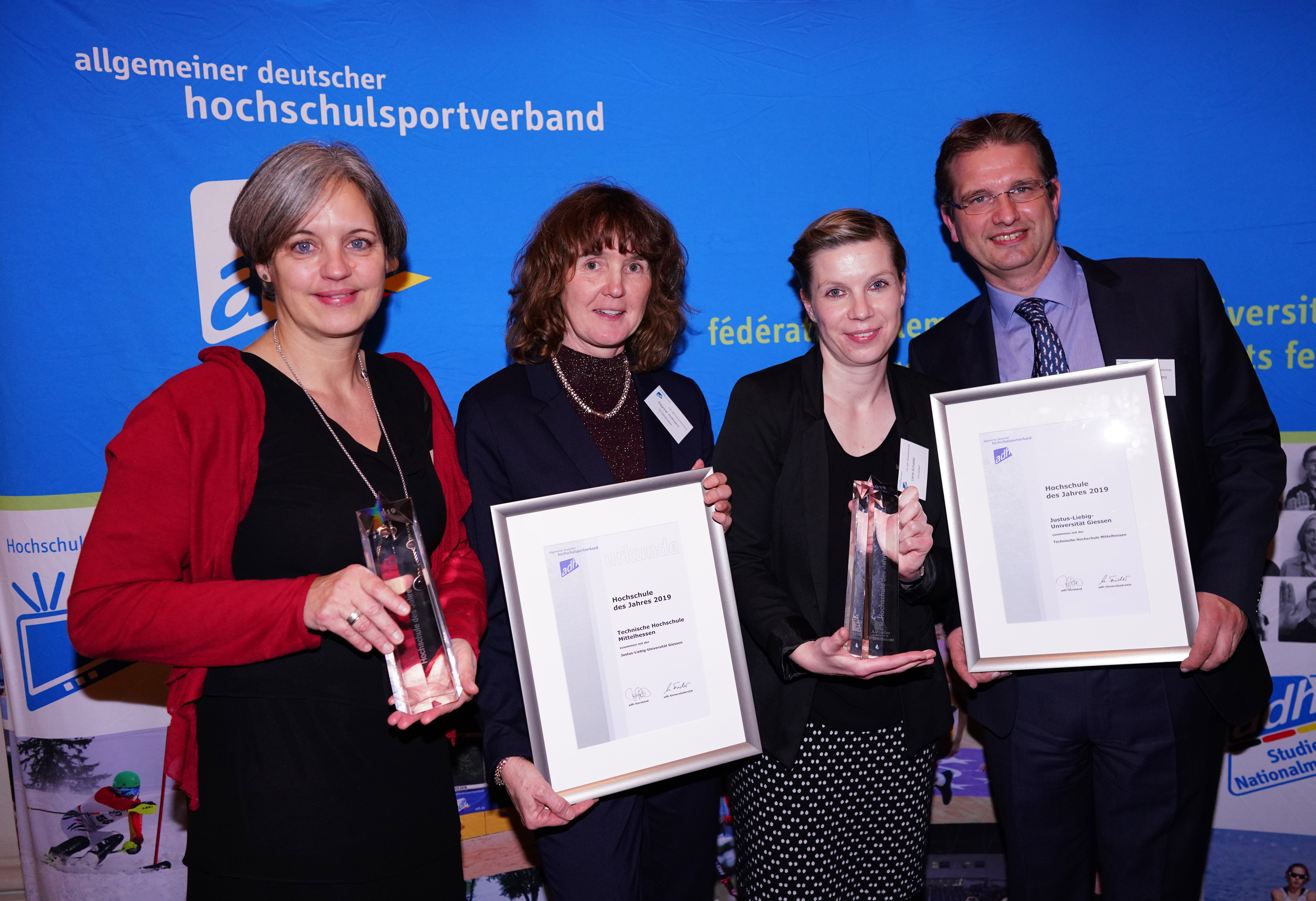 In der Universitätsstadt Gießen richtet sich das Angebot der beiden Hochschulsportstandorte an insgesamt über 46.000 Studierende und rund 6.500 Beschäftigte. In beiden Hochschulen ist der Hochschulsport hervorragend in das Hochschulleben eingebunden; beide Einrichtungen bieten ein innovatives Sportprogramm und die besondere Zusammenarbeit in unterschiedlichen Bereichen mit dem Bundesverband. In der Laudatio führten die adh-Vorstandsmitglieder Dirk Kilian und Miriam Lange daher eine ganze Reihe von Gründen für die Vergabe des Titels nach Gießen an. Für die THM nahm Vizepräsidentin Prof. Dr. Katja Specht, zuständig für Studium und Lehre, den adh-Preis in Hamburg entgegen, für die JLU Prof. Dr. Michael Lierz, der als Vizepräsident für wissenschaftliche Infrastruktur auch für den Allgemeinen Hochschulsport (ahs) zuständig ist.