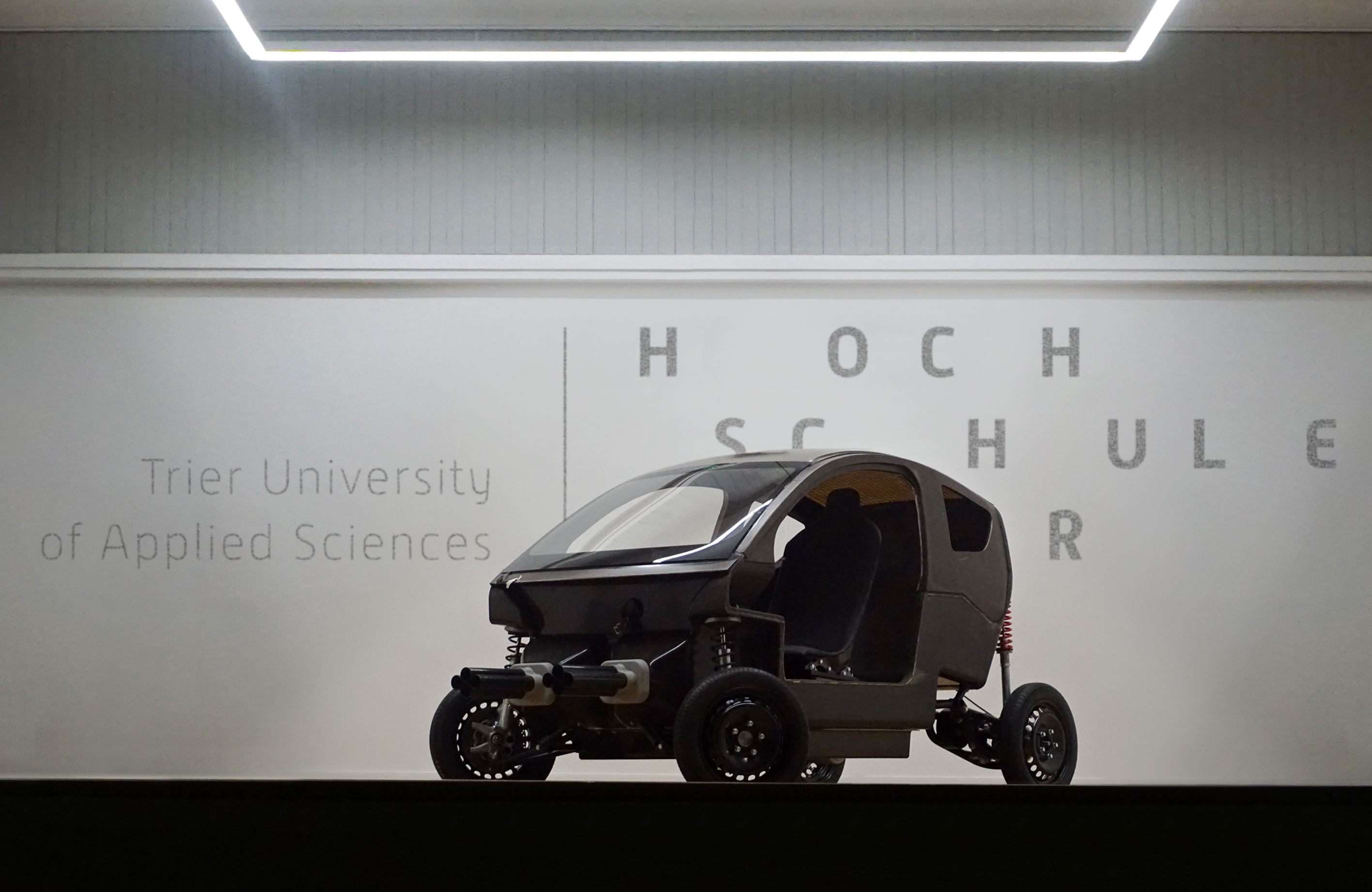Möglich wird dieses äußerst geringe Fahrzeuggewicht bei gleichzeitiger Erfüllung in Europa geltenden Gesetze für die passive Sicherheit, also der Crashanforderungen, durch den Einsatz naturfaserverstärkter Kunststoffe (NfK) sowohl für die tragenden Fahrzeugstrukturen, als auch für Verkleidungsbauteile. Das für den Einsatz von NfK notwendige Knowhow ist von dem vorwiegend studentischen Forscherteam durch jahrelange konsequent aufeinander aufbauende Arbeiten zur Charakterisierung und Verarbeitung dieser Leichtbauwerkstoffe erarbeitet worden. Darauf aufbauend konnte jetzt gemeinsam mit weiteren Wissenschaftlern des Fachbereichs Technik an der Hochschule Trier ein umfangreiches Forschungsvorhaben eingeworben werden, welches von der Carl-Zeiss-Stiftung mit einer o. € über drei Jahre gefördert wird.