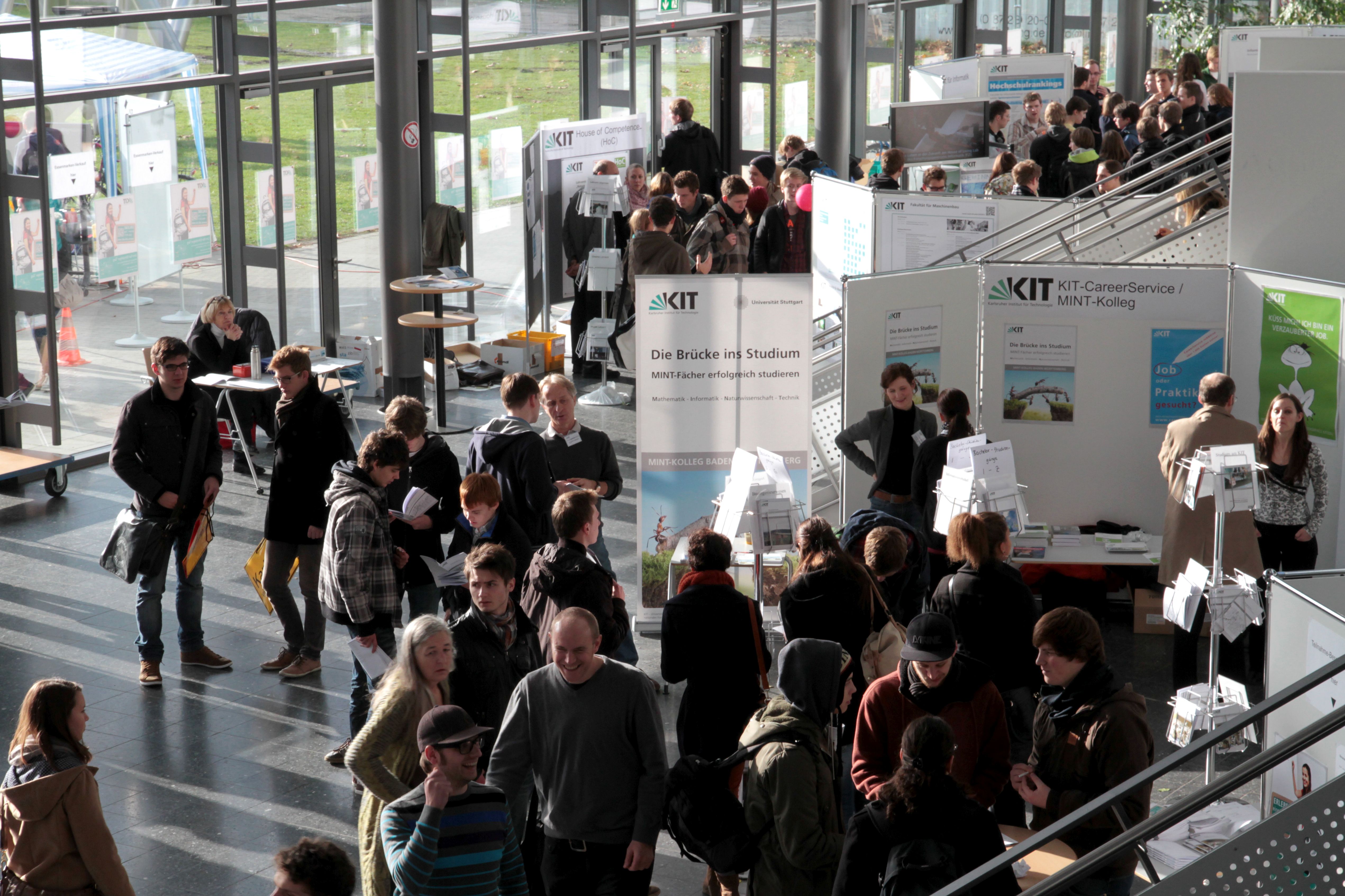 Bis 16:00 Uhr informieren die KIT-Fakultäten und Service-Einrichtungen an den Ständen im Foyer des Audimax über die jeweiligen Angebote. Neben dem MINT-Kolleg Baden-Württemberg stellen sich unter anderem das House of Competence (HoC), das ZAK | Zentrum für Angewandte Kulturwissenschaft und Studium Generale, das International Students Office, der KIT Career Service, die Deutsch-Französische Initiative KIT-DeFI sowie das Studierendenwerk Karlsruhe vor. Interessierte erhalten hier auch Informationen zur beruflichen Ausbildung am KIT.