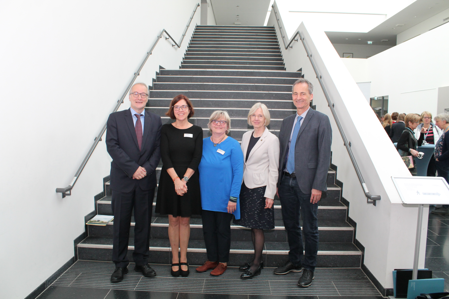 Bildunterschrift: Kamen zusammen, um die Ergebnisse der Studie in der Öffentlichkeit vorzustellen (im Bild v.l.n.r.): Dr. Frank Stollmann (Leitender Ministerialrat im NRW-Ministerium für Arbeit, Gesundheit und Soziales), Hebammenwissenschaftlerin Prof. Dr. Nicola Bauer, Hebammenwissenschaftlerin Prof. Dr. Rainhild Schäfers, hsg-Präsidentin Prof. Dr. Anne Friedrichs und Arndt Winterer (Leiter des LZG.NRW). Foto: hsg Bochum