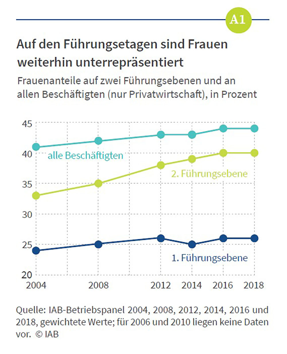 „Seit Januar 2016 ist das Gesetz für die gleichberechtigte Teilhabe von Frauen und Männern an Führungspositionen in Kraft. Mit der Verpflichtung zur Festlegung und Veröffentlichung verbindlicher Zielgrößen zur Erhöhung des Frauenanteils in Vorständen und obersten Managementebenen soll diese gesetzliche Regelung in das Personalmanagement von Unternehmen mit mehr als 500 Beschäftigten hineinwirken“, so die IAB-Forscherinnen Kohaut und Möller. Gleichzeitig stellen sie allerdings fest: „Die Einführung des neuen Gesetzes hat - zumindest auf Betriebsebene - keinen weiteren Zuwachs gebracht“.