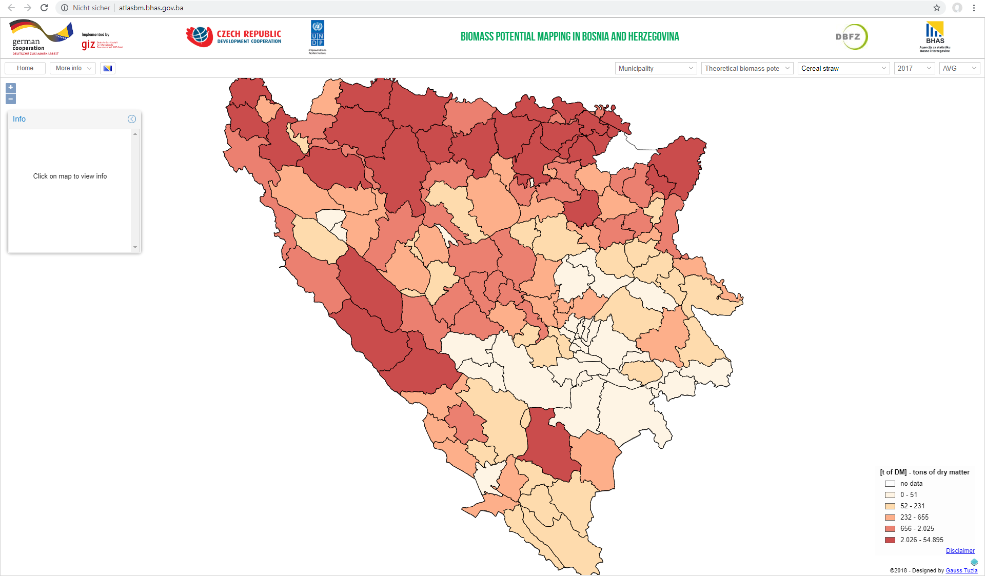 Based on an updatable database, an interactive web atlas was developed for Bosnia and Herzegovina (BiH) to visualize the potential of 23 agricultural and forestry biomasses. This consistent information on the biogenic raw material base is a central pillar for the strategic evaluation of options for action in the bioenergy context. The results are publicly available at http://atlasbm.bhas.gov.ba/.