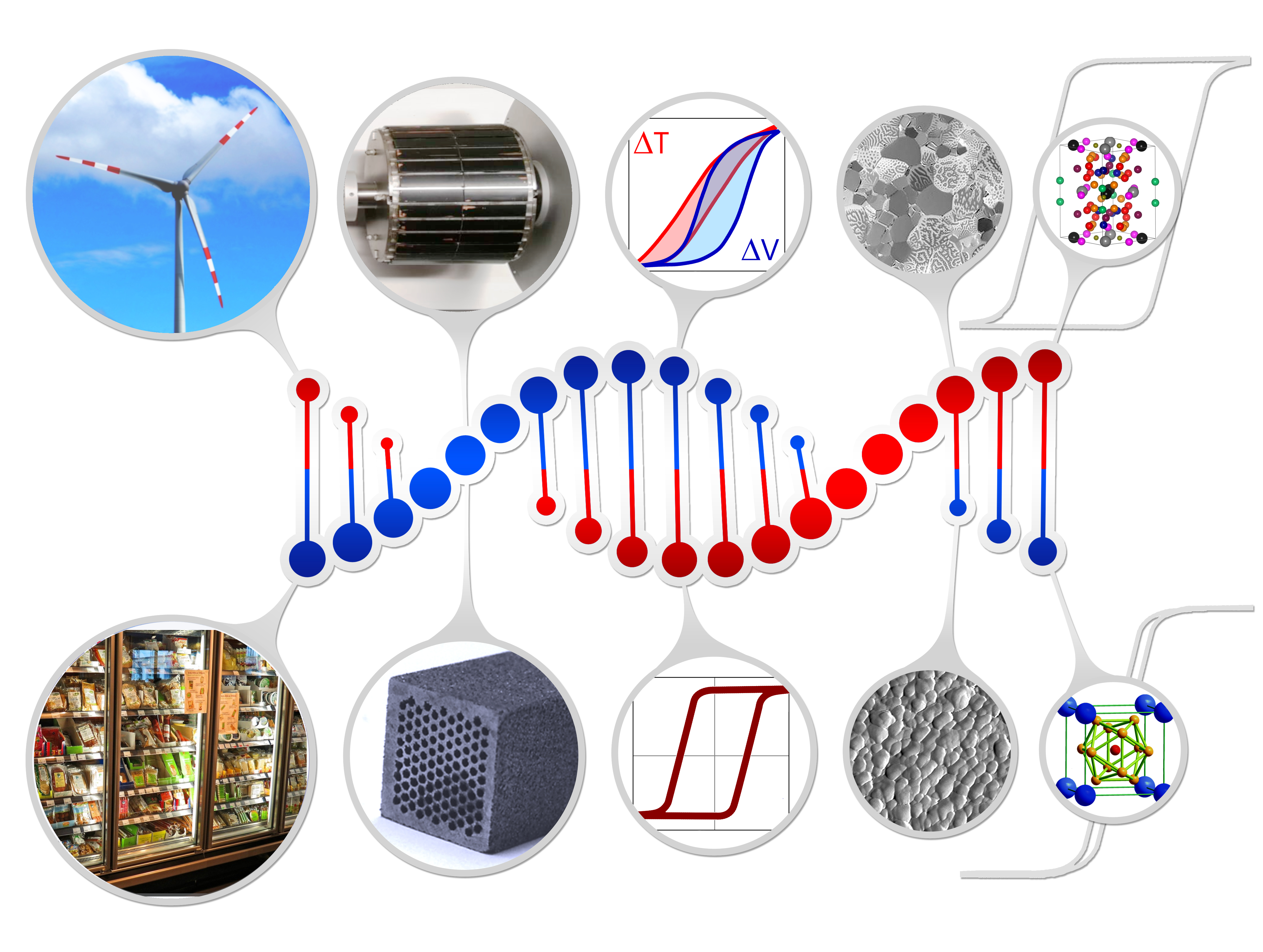 Die Temperatur eines Werkstoffes gezielt über ein Magnetfeld verändern können: Das ist – vereinfacht ausgedrückt – das Prinzip hinter magnetokalorischen Materialien. Auf diese Weise ließen sich leise, mit sehr geringem Energieeinsatz und ohne klimaschädliche Gase Kühlschränke und Klimaanlagen betreiben. Die Anforderungen an Mobilität und nachhaltige Stromerzeugung sind dagegen etwas andere und beruhen auf Permanentmagneten: Windräder sollen einen möglichst hohen Ertrag liefern, Elektroautos mit energie- und rohstoffsparend unterwegs sein – und vor allem weit: Ein um 2% effizienterer Permanentmagnet führt zu 20 km mehr Reichweite. Effiziente Elektromobilität und Robotik verlangt starke Magnete.