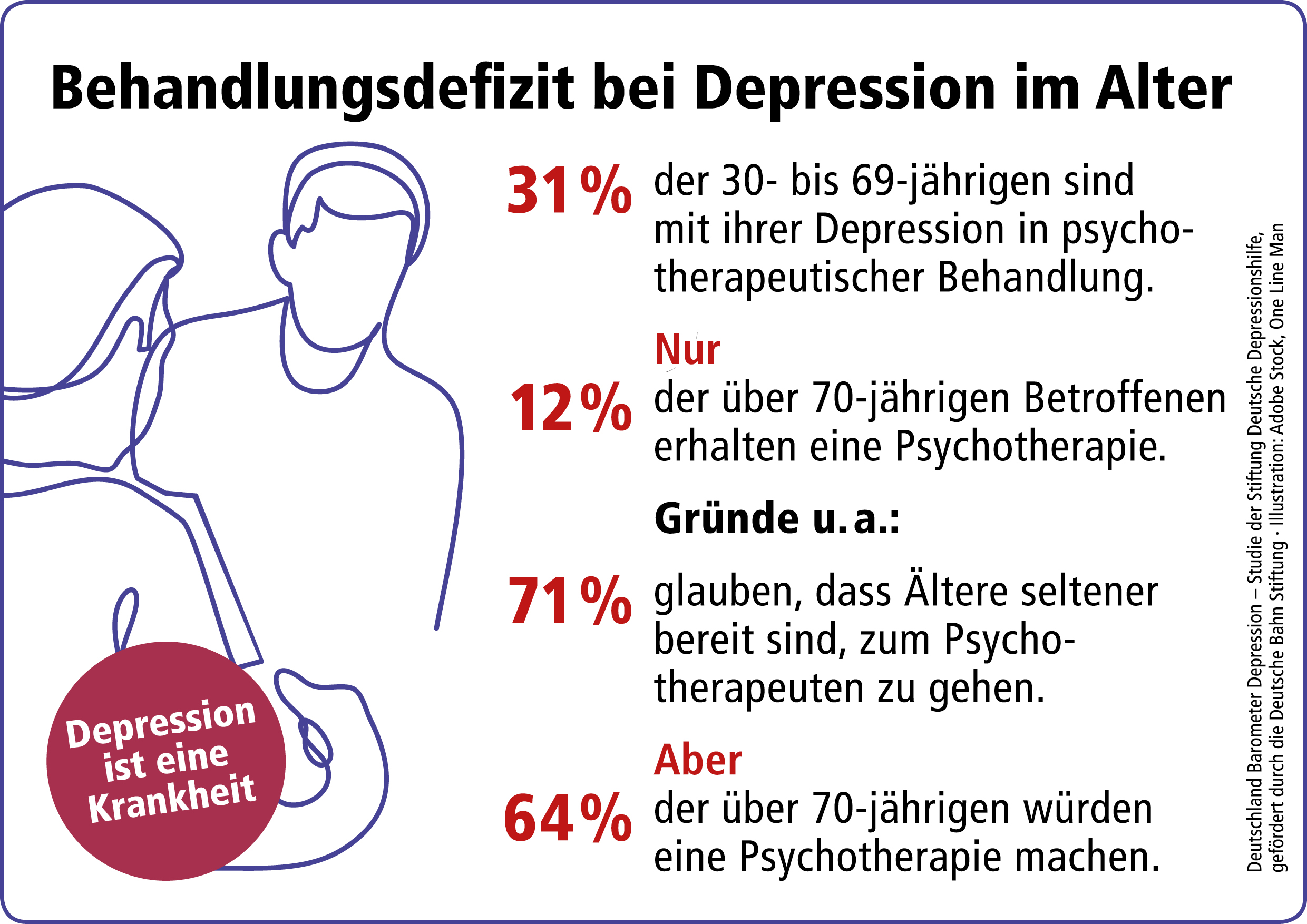 86% der Deutschen gehen davon aus, dass es Älteren schwerer fällt, sich bei Depression Hilfe zu suchen. Dies gilt insbesondere für die Psychotherapie: 71% der Befragten glauben, dass Ältere seltener bereit sind, die Hilfe eines Psychotherapeuten anzunehmen. Tatsächlich sind 31% der an Depression erkrankten Befragten zwischen 30 und 69 Jahren in psychotherapeutischer Behandlung. Bei den Betroffenen über 70 Jahren sind es nur 12%. Das Deutschland-Barometer Depression deckt jedoch einen großen Irrtum auf, denn: Eine deutliche Mehrheit (64%) der befragten Menschen über 70 wäre bereit, eine Psychotherapie in Anspruch zu nehmen. „Älteren Menschen wird viel zu selten eine Psychotherapie angeboten. Sie werden im Versorgungssystem eindeutig benachteiligt“, so Ulrich Hegerl.