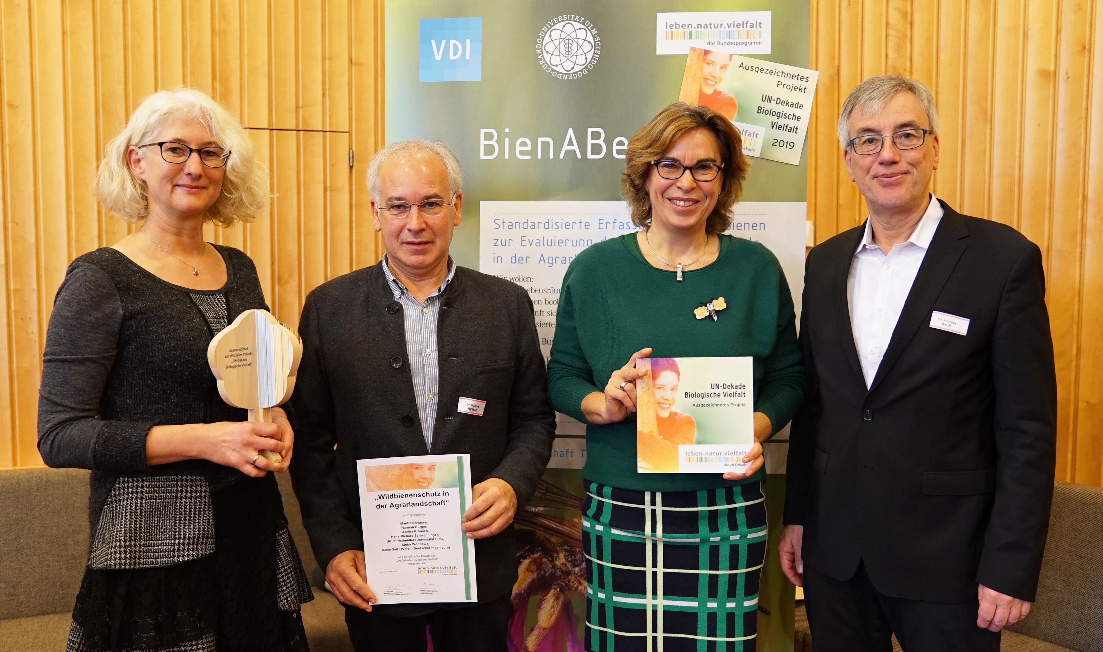 Vollständige Bildunterschrift: Forschende der Universität Ulm und des Vereins Deutscher Ingenieure freuten sich über die Auszeichnung von BienABest als Projekt der UN-Dekade Biologische Vielfalt (v.l.): Dr. Heike Seitz (VDI), Prof. Manfred Ayasse (Universität Ulm), Dr. Ljuba Woppowa (VDI) und der Laudator Dr. Andreas Krüß vom Bundesamt für Naturschutz (Foto: Evangelische Akademie Loccum)