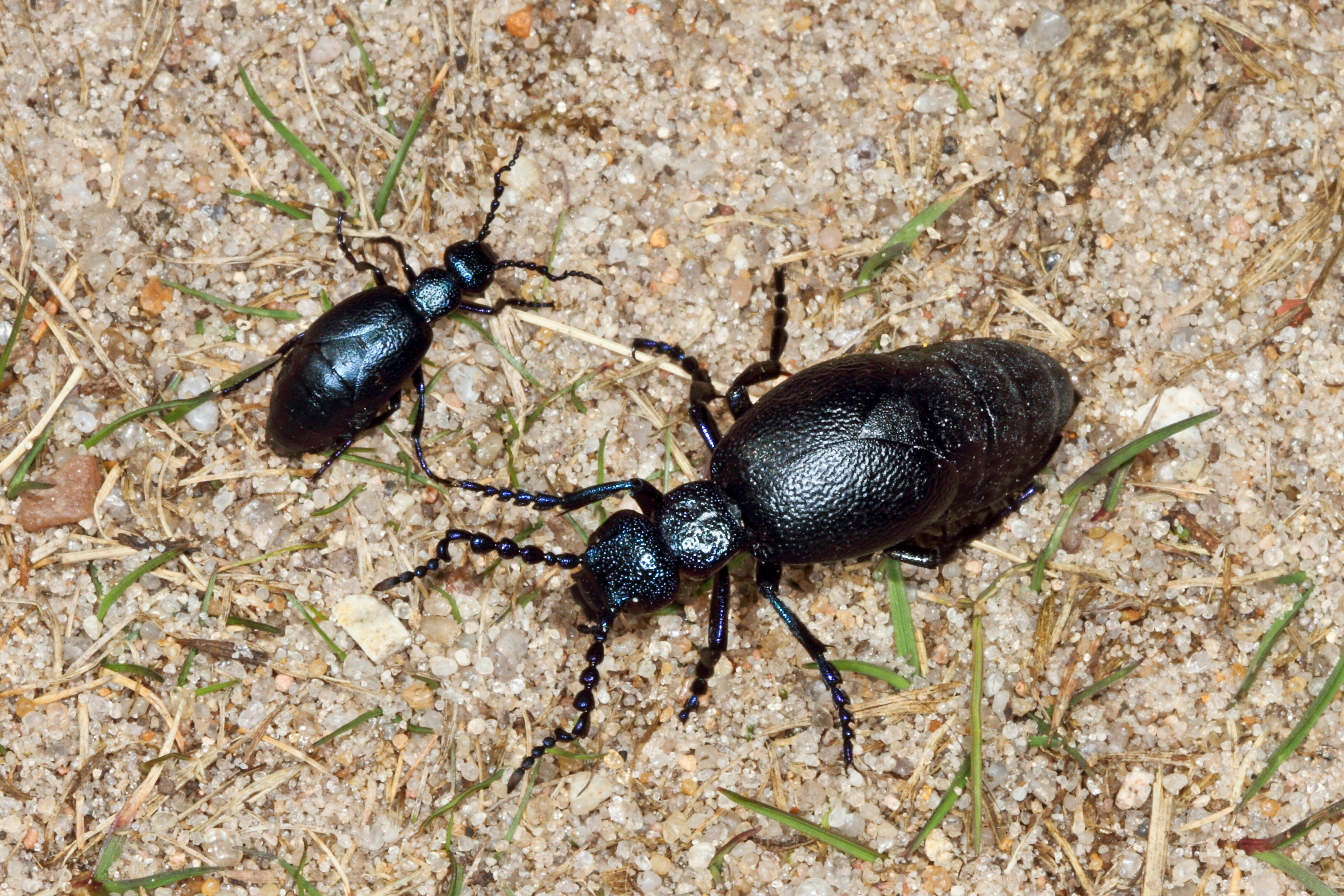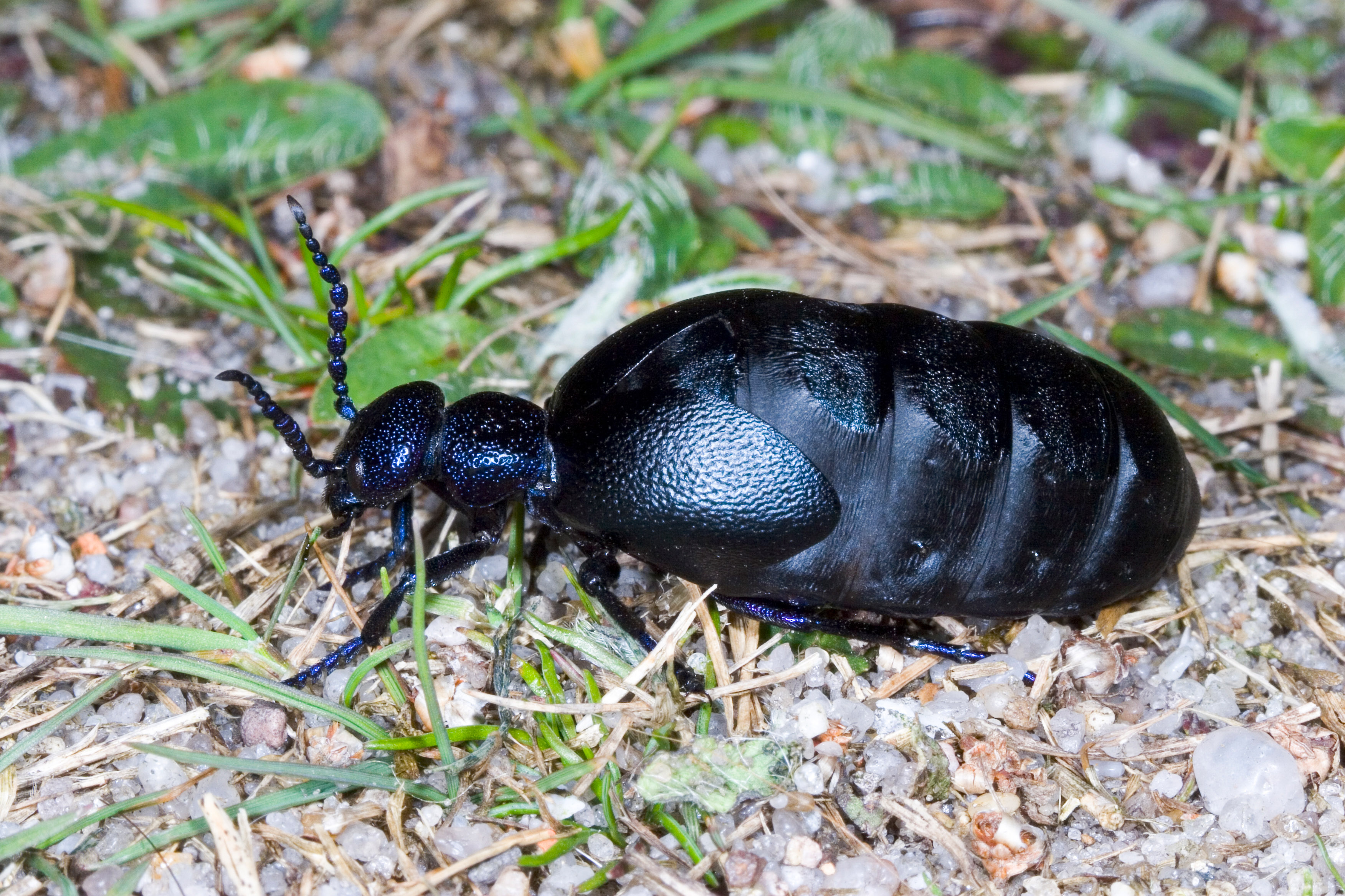 Der Schwarzblaue Ölkäfer (Meloe proscarabaeus) wird 10 bis 35 Millimeter lang und hat es in sich: Er besitzt ein hochgradig wirksames Gift!