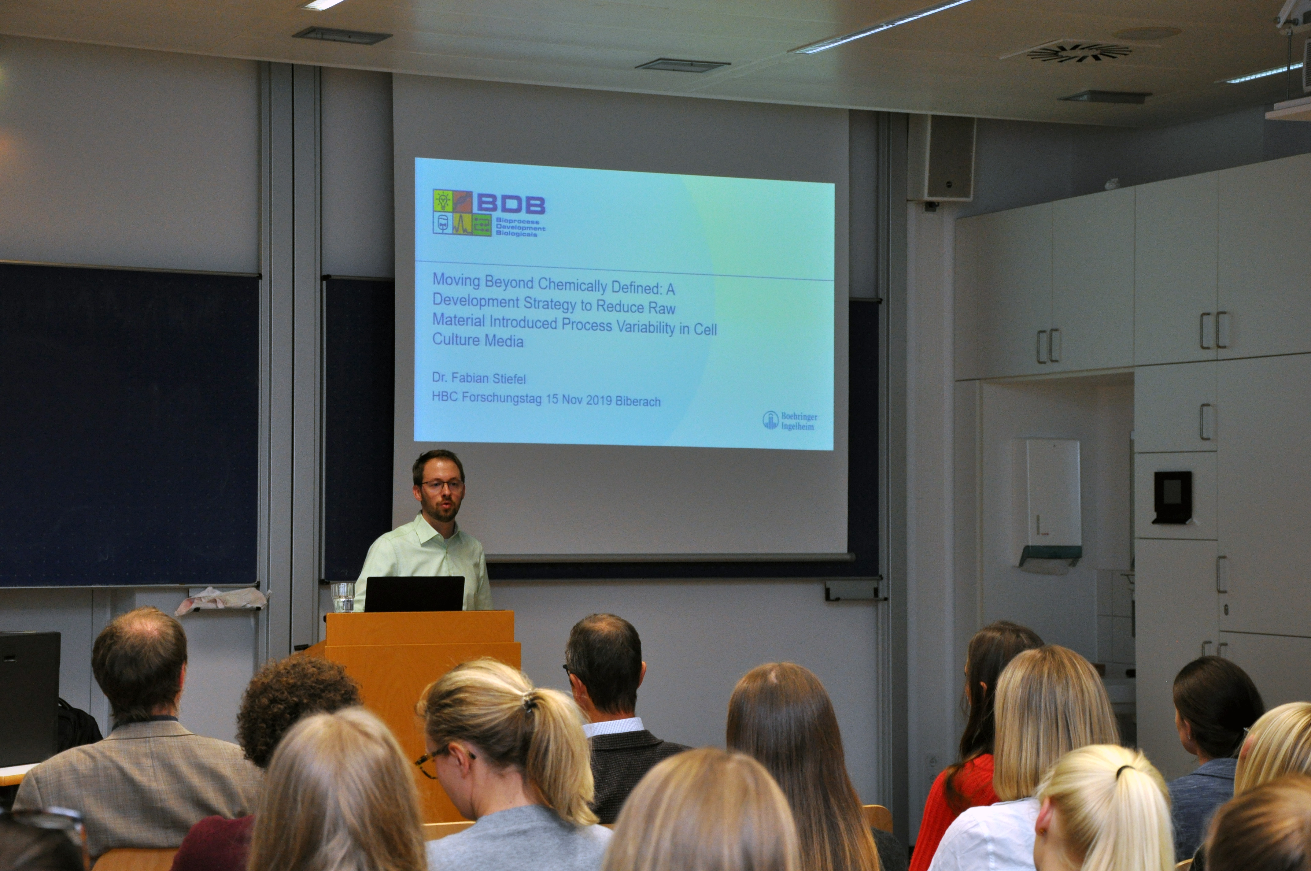 Der Impulsvortrag von Dr. Fabian Stiefel, ehemaliger Doktorand am Institut für Angewandte Biotechnologie, rundete das Programm des Forschertages schließlich ab und spannte mit seinem Vortrag („Moving Beyond Chemically Defined: A Development Strategy to Reduce Raw Material Introduced Process Variability in Cell Culture Mediaden“) den Bogen zum Alumnitag, mit dem die Fakultät die Veranstaltung verbunden hatte. Dr. Fabian Stiefel ist bei Boehringer Ingelheim inzwischen in der Entwicklung von Zellkulturmedien tätig. Eine Aufgabe, die die Entwickler tatsächlich vor hohe Anforderungen stellt, wie Stiefel deutlich machte, da die Zellen durch ihr Wachstum die Medienzusammensetzung ändern und auf diese Änderungen höchst sensibel reagieren. Ständige Analysen und damit verbundenes Nachsteuern bei der Zusammensetzung sind daher unabdingbar. Auf welch interdisziplinärem Niveau dies geschieht, welche zunächst unerwarteten Probleme z.B. bei einer Vergrößerung des Kulturmaßstabs auftreten und wie die Medienentwickler diese lösen, hielt das Publikum im Bann.