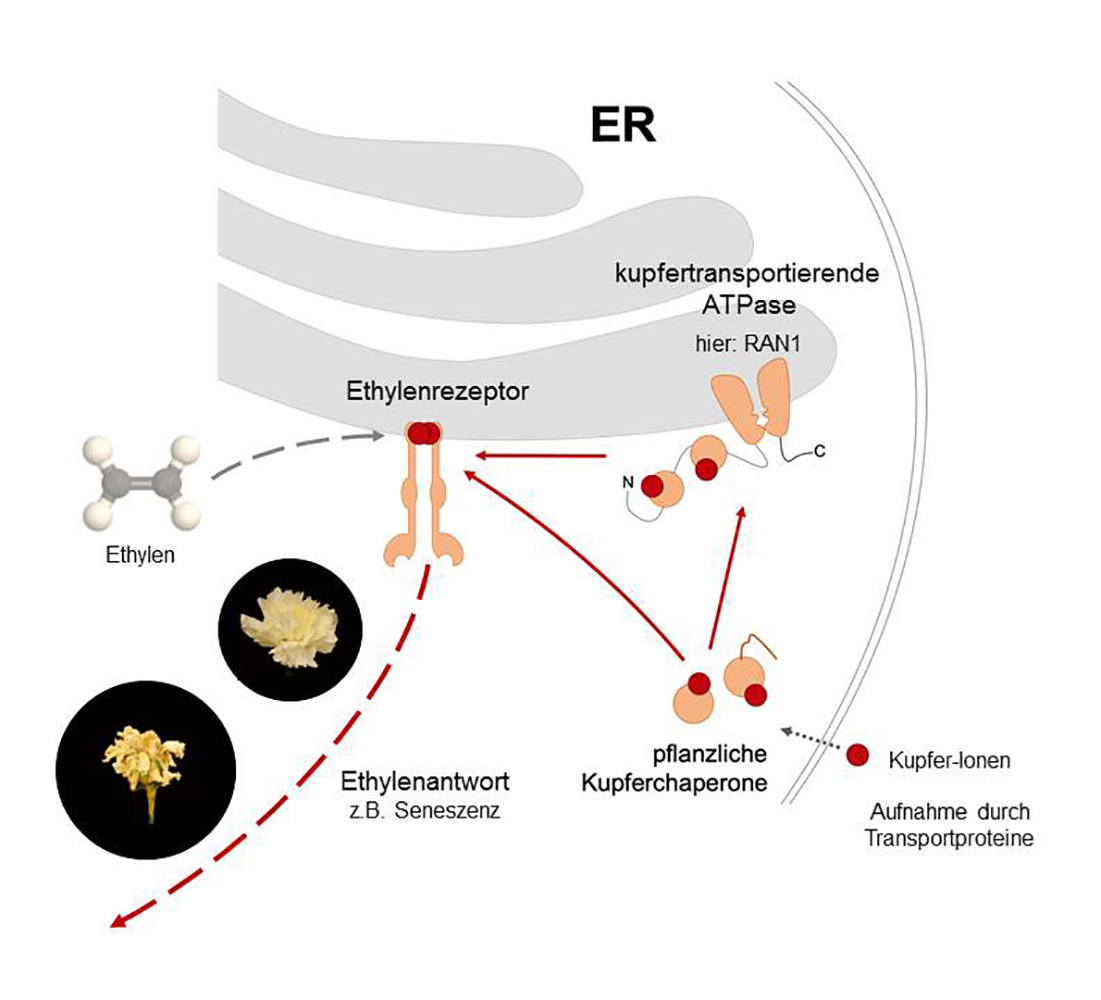 Ethylen bindet an bestimmte Rezeptoren an einem Membransystem innerhalb der Zelle, dem sogenannten Endoplasmatischen Retikulum (kurz ER). Durch diese Verbindung löst es die Prozesse aus. Voraussetzung für die Bindung des Pflanzenhormons an die Rezeptoren ist, dass diese zuvor Kupfer-Ionen binden. Aufgrund seiner zellschädigenden Wirkung können die Kupfer-Ionen – nach ihrer Aufnahme in die Zelle durch spezifische Transportproteine – jedoch nicht als freie Ionen zu den Rezeptoren gelangen.