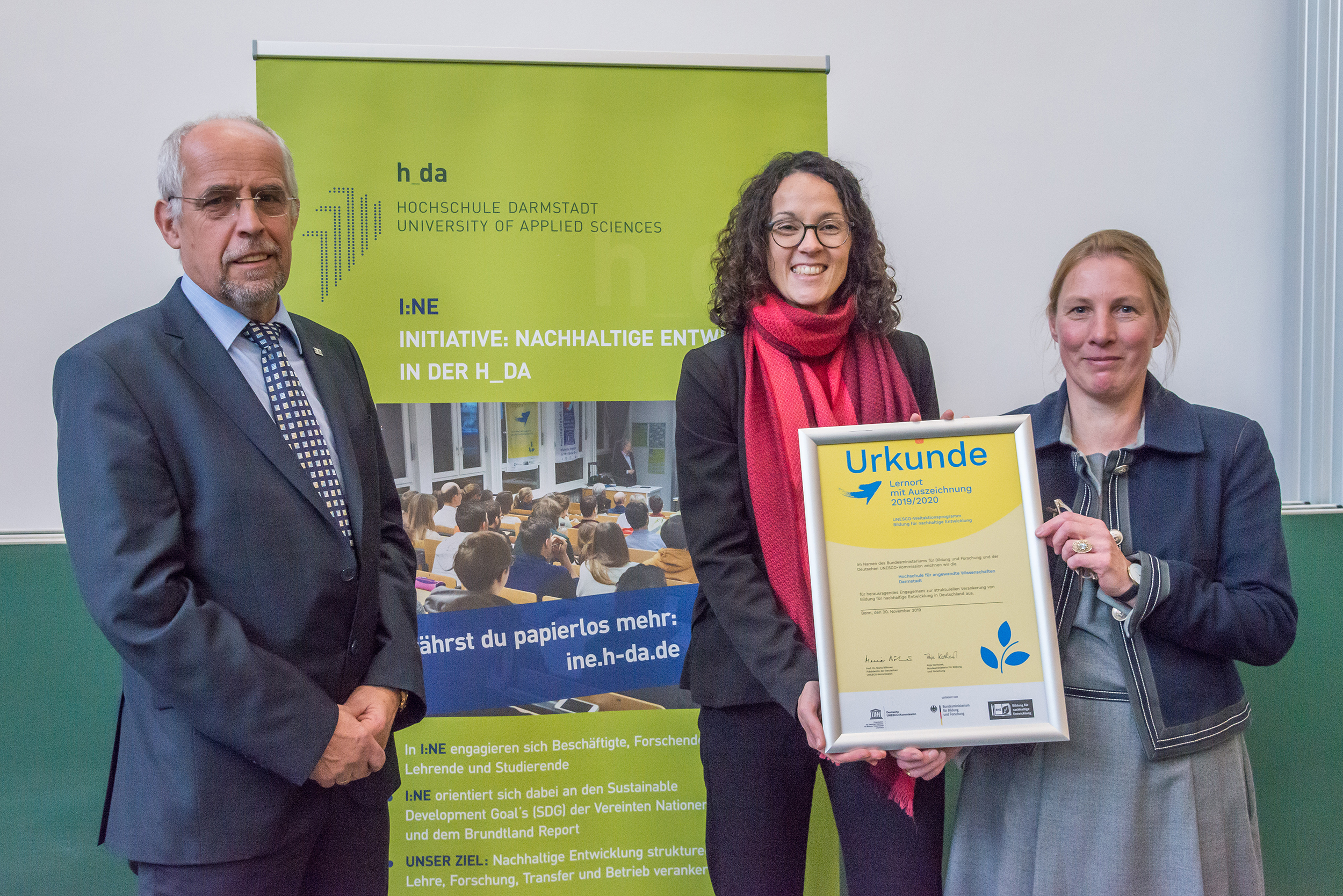 Die h_da bleibt „herausragender Lernort für Nachhaltige Entwicklung“. Wie bereits 2017 wurde die h_da vom BMBF und der Deutschen UNESCO-Kommission im Rahmen der nationalen Umsetzung des UNESCO-Weltaktionsprogramms „Bildung für Nachhaltige Entwicklung (BNE)“ ausgezeichnet. Die Jury würdigt damit die konsequente Ausrichtung der h_da auf Nachhaltige Entwicklung.