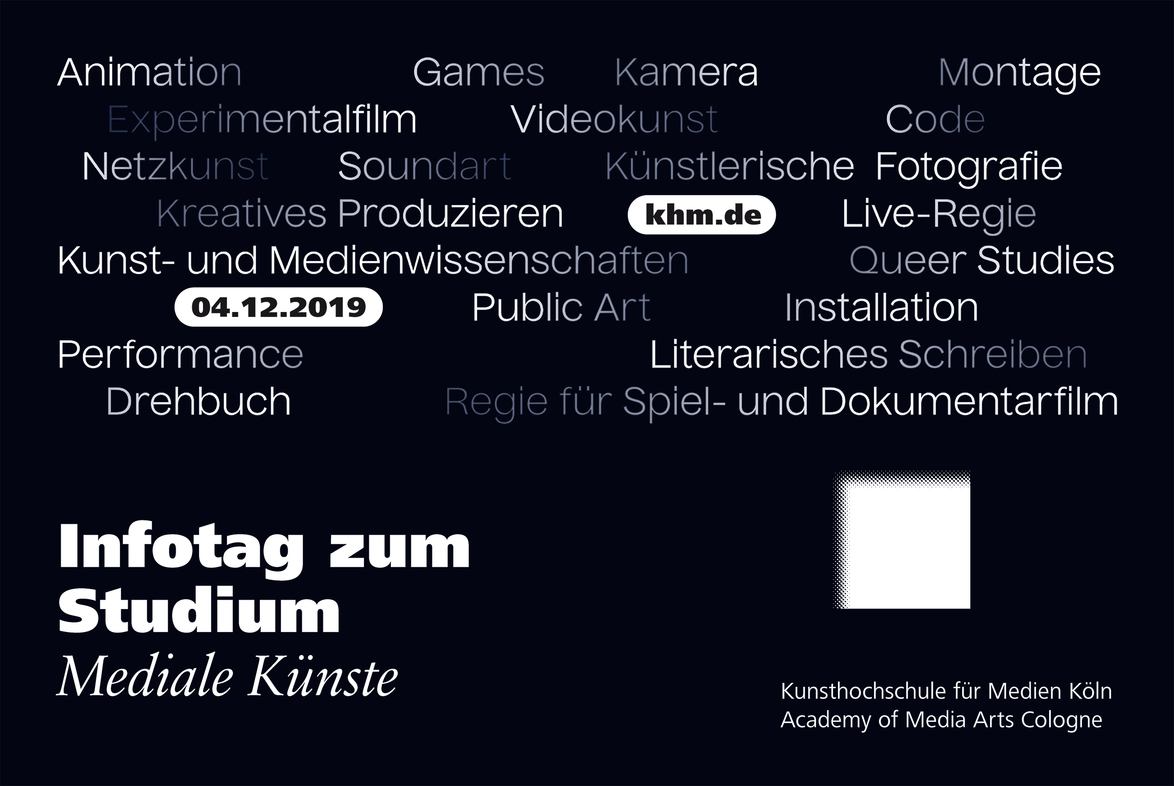 Der Infotag bietet einen breiten ersten Einblick in Ziele und Möglichkeiten eines Diplomstudiums an der KHM in 9 Semestern (Diplom 1) oder 4 Semestern (Diplom 2). Auf dem Programm stehen Informationen zu den beiden Möglichkeiten, an der KHM zu studieren, Einblicke in offene Studios, Labore, Werkstätten, Präsentationen aus unterschiedlichen Lehrgebieten mit Projektbeispielen aus dem interdisziplinärem Studium der "Medialen Künste“.