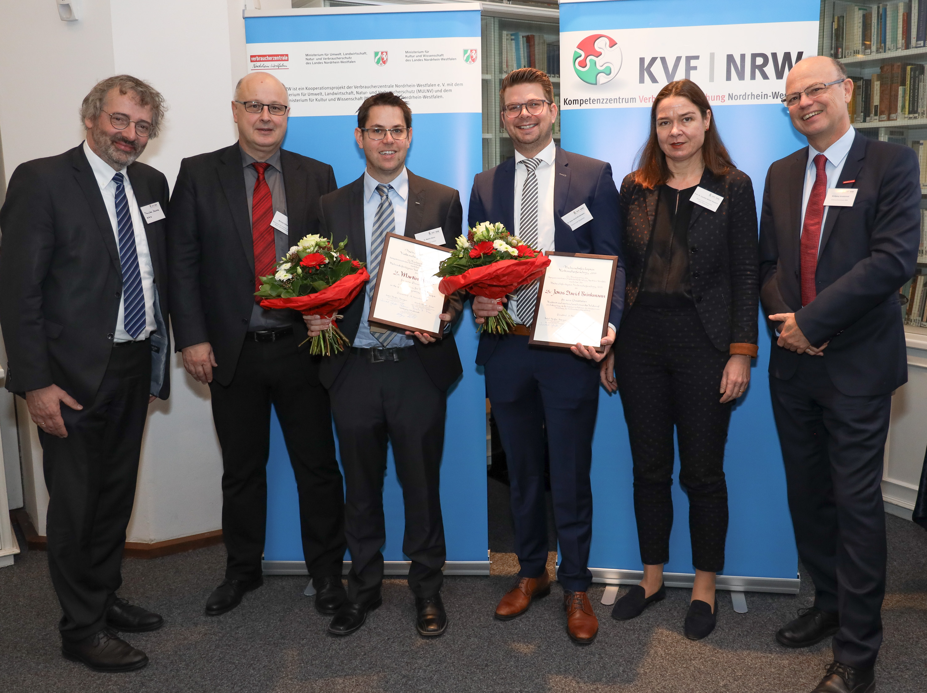 Im Rahmen des 15. Workshops Verbraucherforschung wurden Dr. Jonas David Brinkmann und Dr. Martin Henze für ihre herausragenden Leistungen auf dem Feld der Verbraucherforschung ausgezeichnet. Thorsten Menne, Gruppenleiter Forschungsförderung und Forschungspolitik im Ministerium für Kultur und Wissenschaft des Landes Nordrhein-Westfalen (MKW), und Ministerialdirigent Michael Hülsenbusch, Abteilungsleiter Verbraucherschutz im Ministerium für Umwelt, Landwirtschaft, Natur- und Verbraucherschutz des Landes Nordrhein-Westfalen (MULNV), überreichten zusammen mit Verbraucherzentralenvorstand Wolfgang Schuldzinski als Vertreter der Kooperationspartner des Kompetenzzentrums Verbraucherforschung NRW (KVF NRW) die Preise. Die Laudationes hielt Professor Dr. Caroline Meller-Hannich, Inhaberin des Lehrstuhls für Bürgerliches Recht, Zivilprozess- und Handelsrecht an der Martin-Luther-Universität Halle-Wittenberg, als Mitglied des Wissenschaftlichen Beirats des KVF NRW.