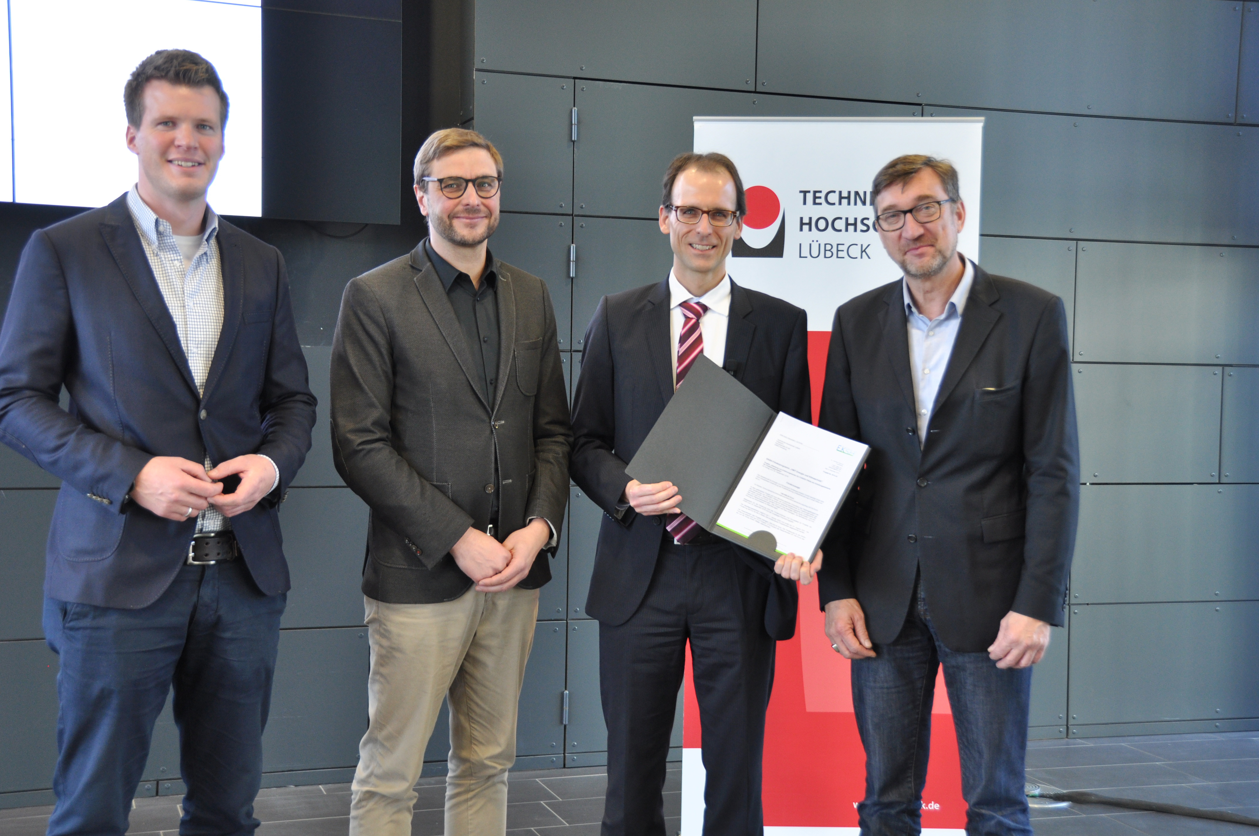 Der eigens aus Kiel angereiste Geschäftsführer der EKSH, Stefan Sievers, betonte bei der Übergabe der Förderzusage: „Ich würde mich freuen, wenn wir im nächsten Jahr wieder spannende Projekte aus Lübeck zur Unterstützung der Energiewende bewilligen könnten.“ Sievers wies darauf hin, dass die Förderquote von regelmäßig 80 % erhöht werden könne, wenn junge oder kleine Unternehmen eingebunden seien oder die Erstberufung von Antragsteller*innen aus der Hochschule nicht länger als fünf Jahre zurückliege. Die EKSH fördere außerdem Promotionsstipendien, die auch als Anschlussstipendium nach einem HWT-Projekt gewährt werden könnten.