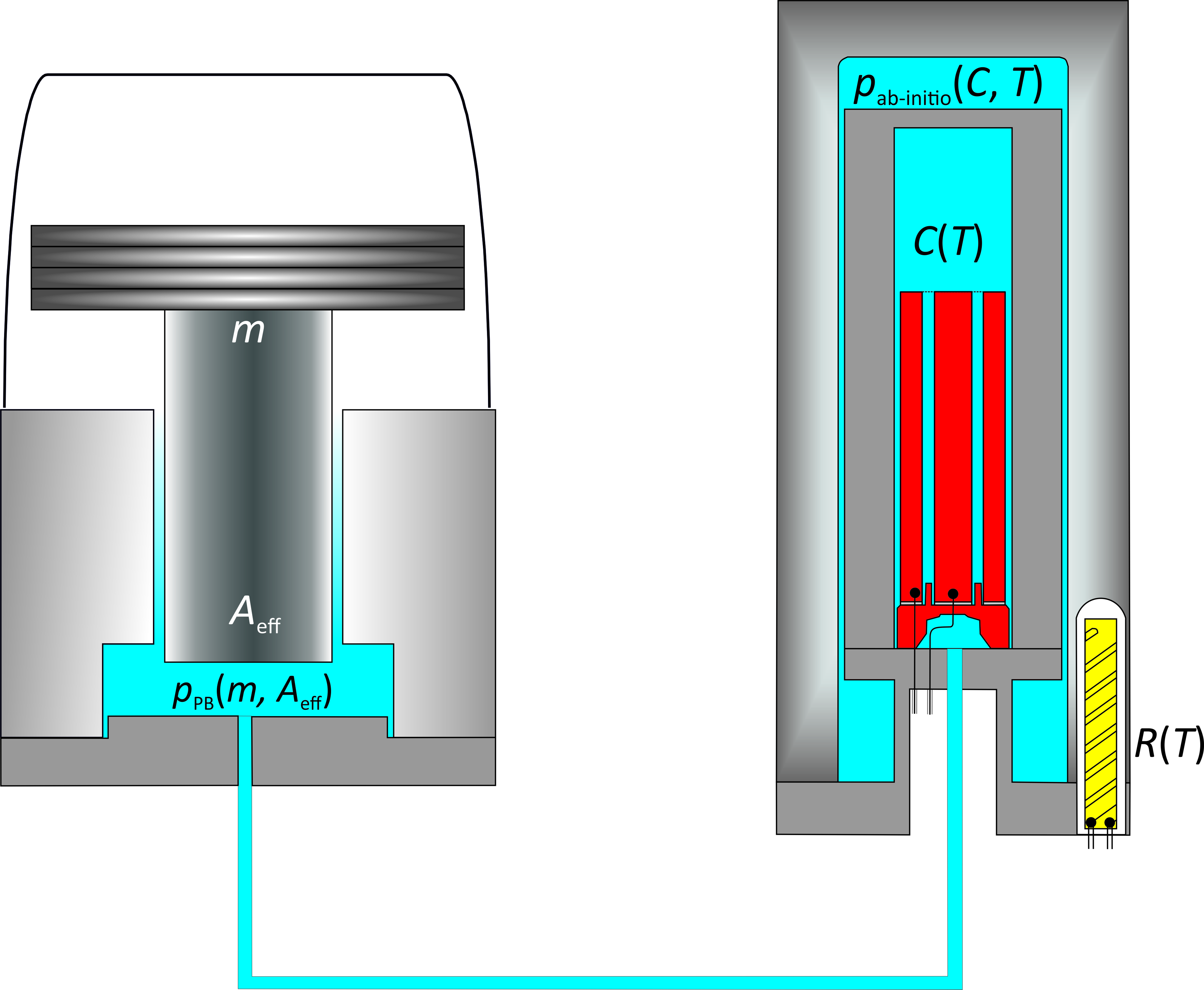 Rechts: der neue elektrische Ansatz: Die durch das Messgas hervorgerufene relative Änderung der Kapazität C(T) bei einer bekannten Temperatur T, die mit einem kalibrierten Widerstandsthermometer R(T) ermittelt wird, lässt sich direkt mit dem Gasdruck verknüpfen. In die nötigen Ab-initio-Berechnungen der Gaseigenschaften gehen die Dielektrizitätskonstante und die Interaktion der Gasteilchen ein: pab-initio(C,T, Gasab-initio)(Abbildung: PTB)