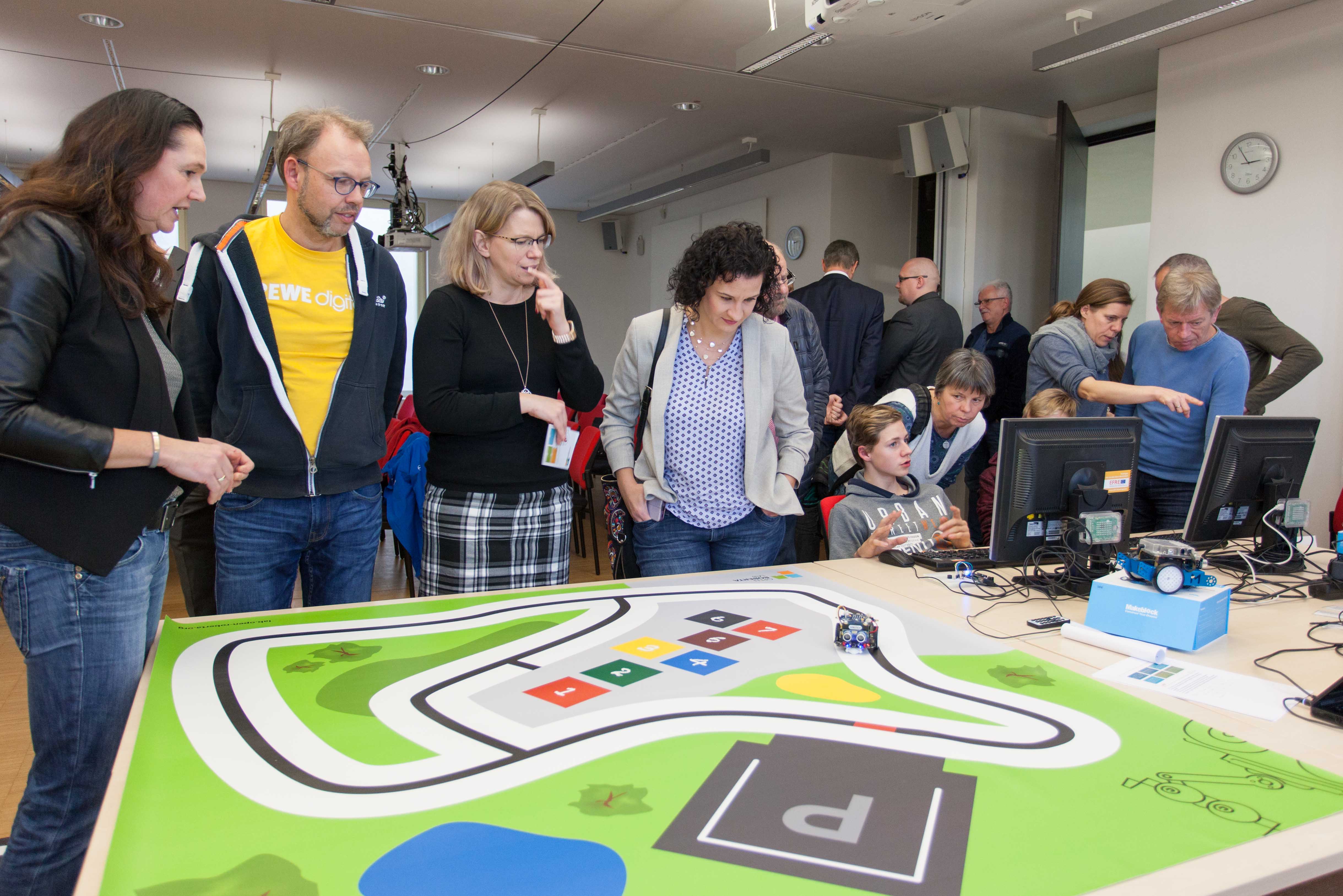 Die Eröffnungsfeier nutzten die Initiatoren auch, um den gemeinsamen Kooperationsvertrag zu unterschreiben. Der Überbringer des Vertrags war standesgemäß ein kleiner LEGO®-Mindstorms®-Roboter. Nach der Eröffnung konnten sich die Gäste an verschiedenen Mitmach-Stationen einen Einblick verschaffen, was die Schülerinnen und Schüler in den Workshops erwarten wird.