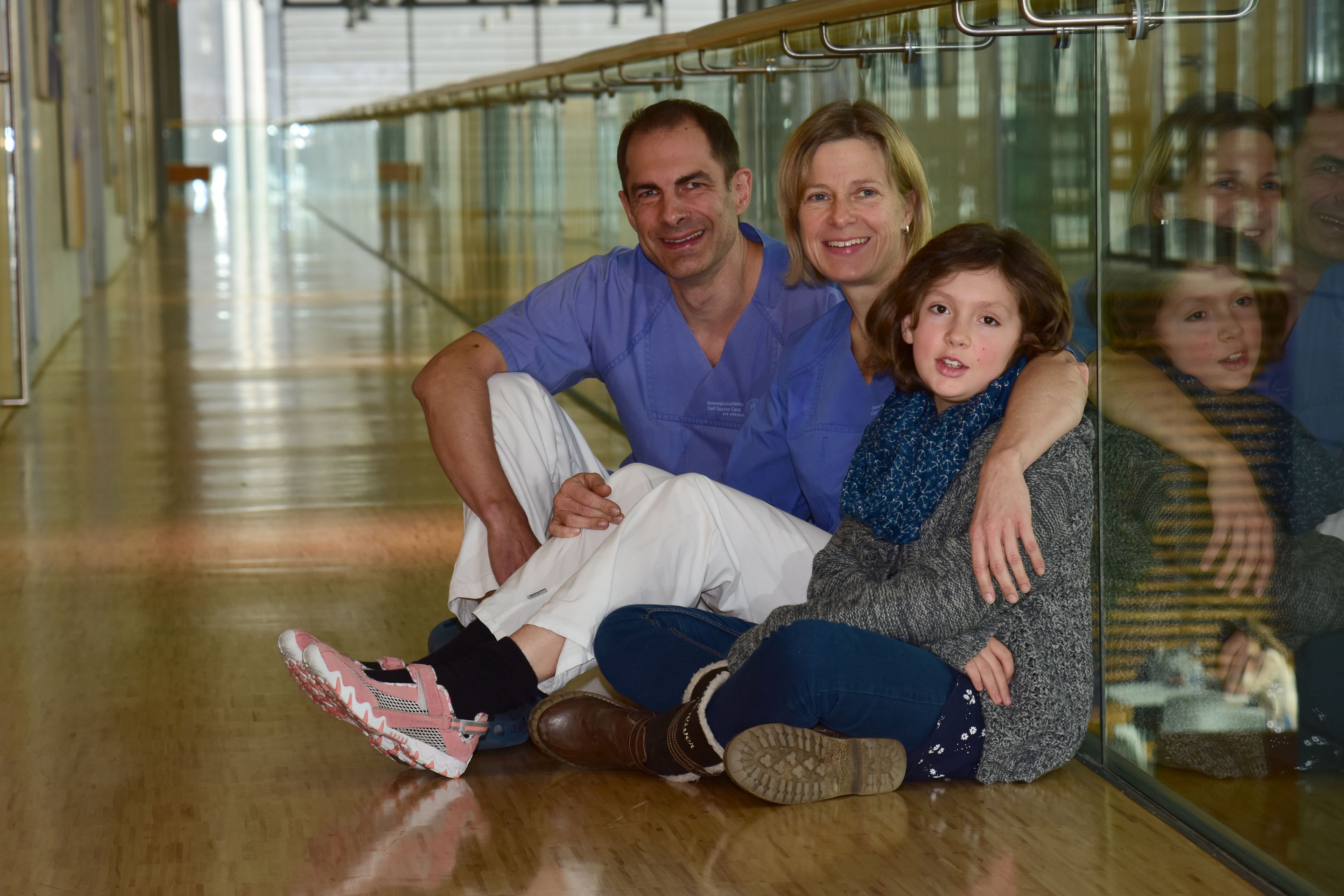 Prof. Sebastian Brenner, Oberarzt der Kinder-ITS des Dresdner Uniklinikums, Henriette Lukaß, Fachkrankenschwester für Kinderintensivmedizin und Annika, die vom Stationsteam nach einem Unfall in den Bergen versorgt wurde und die sich von Ihren schweren Verletzungen auch zur Freude aller sehr gut erholt hat. Foto: Uniklinikum Dresden / Holger Ostermeyer