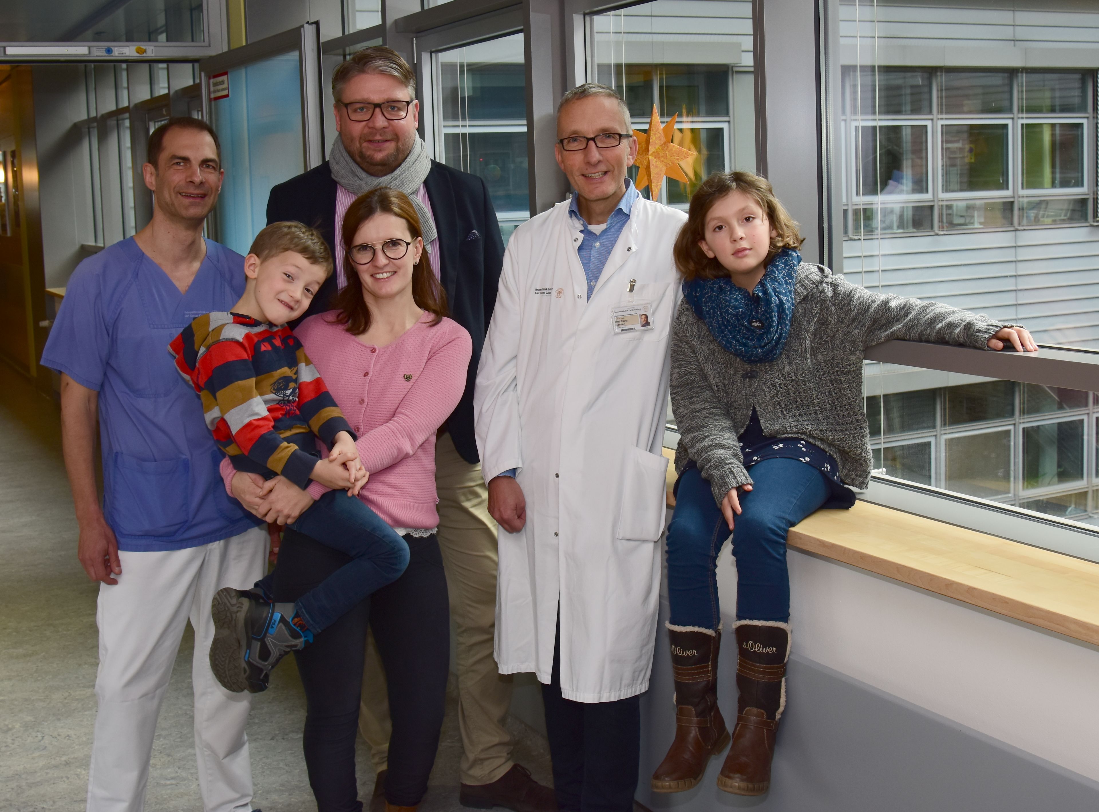 Prof. Sebastian Brenner, Arthur mit seiner Mutter, Thomas Reiche, Prof. Reinhard Berner und Annika auf dem Flur der Kinder-ITS. Arthur und Annika wurden beide hier intensivmedizinisch behandelt und sind wie ihre Eltern dankbar für die ihnen zuteil gewordene Versorgung. Foto: Uniklinikum Dresden / Holger Ostermeyer