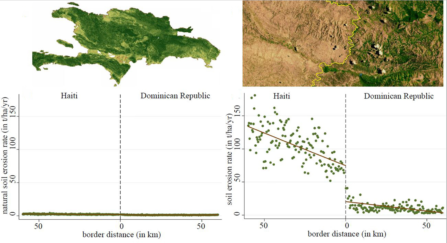 Als ein illustratives Beispiel dient den Forschern die Insel Hispaniola, auf der Haiti und die Dominikanische Republik liegen. Von Natur aus wäre die Insel einheitlich mit dichtem tropischen Wald bedeckt; die natürliche Erosion wäre sehr gering, da die Vegetation den Boden vor Regen schützen würde.