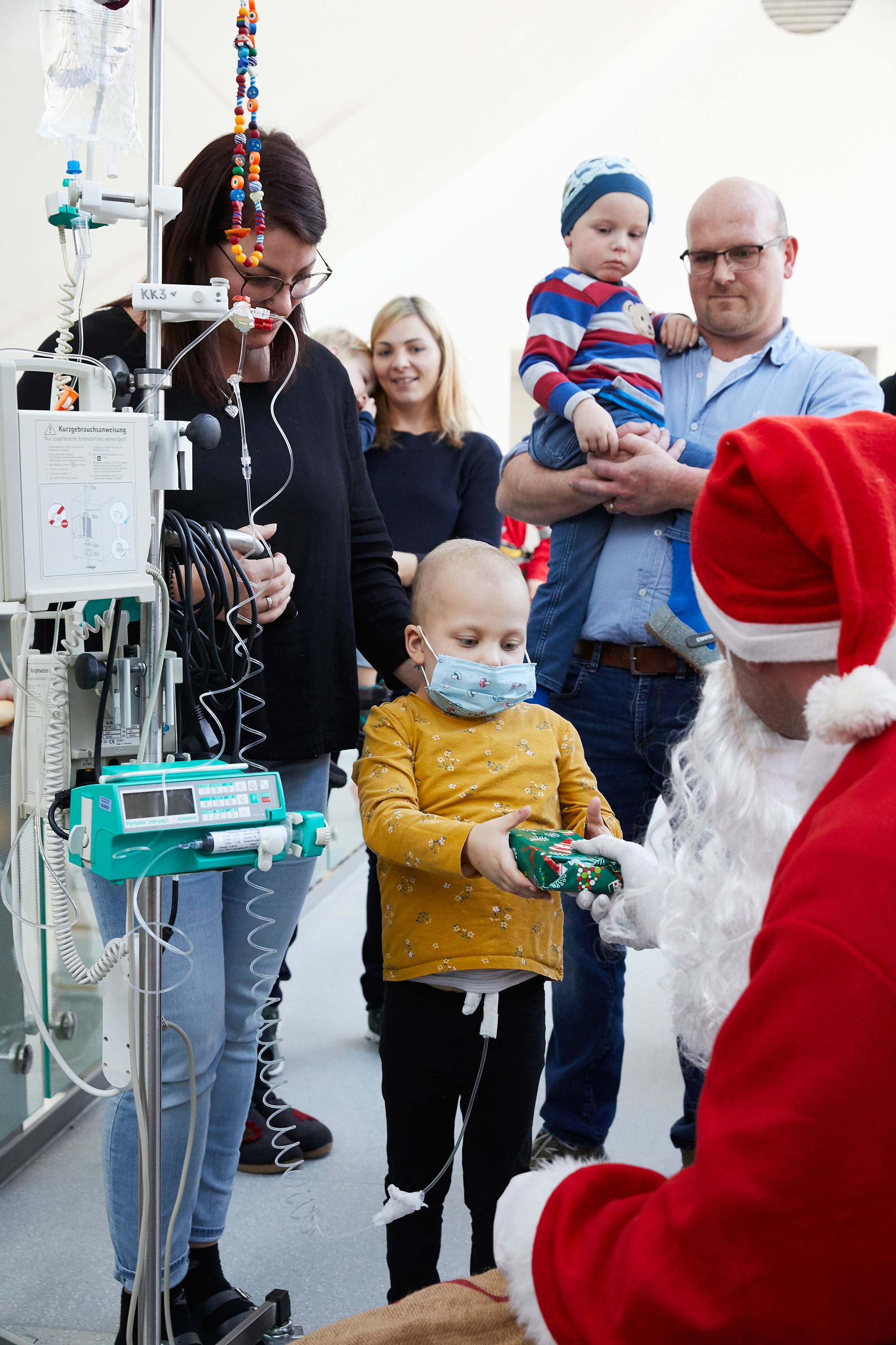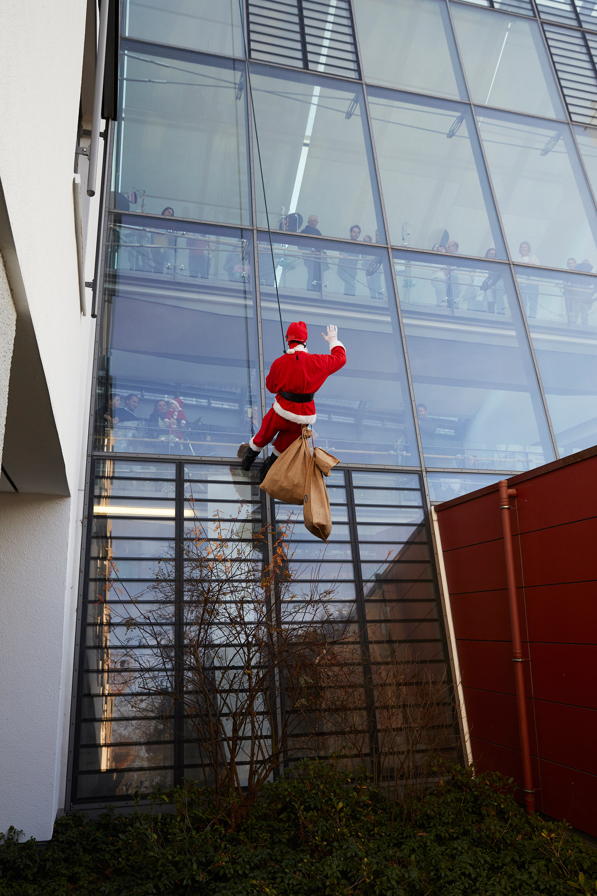 Über 50 Augenpaare fixieren die große Fassade im Foyer der Klinik für Kinder- und Jugendmedizin des Universitätsklinikums Ulm. Erwartungsvoll blicken am heutigen Nikolaus-Tag nicht nur die kleinen Patient*innen nach draußen, auch Mitarbeiter*innen, Eltern und Besucher*innen sind gespannt. Dann endlich tut sich was, ganz oben an der großen Fassade taucht ein brauner Jutesack auf. Von der Galerie aus, die sich über das Foyer erstreckt, haben ihn die Kinder sofort entdeckt. Dann ist er endlich da: „Da ist der Nikolaus!“, ruft der kleine Anton. Und tatsächlich, draußen vor dem Fenster gleitet er langsam in Richtung Boden, in einem roten Gewand und mit schweren schwarzen Stiefeln. Hinter seinem weißen Bart kann man ihn lachen sehen. „Fällt der Nikolaus nicht runter?“ fragt ein anderes Kind besorgt. Der Patient muss sich keine Sorgen machen, der Nikolaus ist gut gesichert.