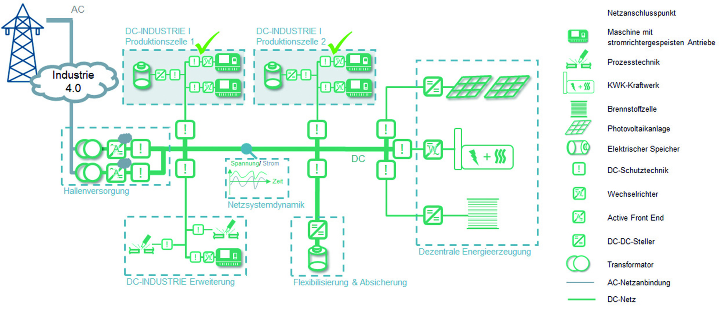 Anfang Oktober 2019 startete das vom Bundeswirtschaftsministerium mit etwa 13 Millionen Euro geförderte Forschungsprojekt „DC-INDUSTRIE2“, in dem die Potenziale der Gleichstromtechnik für industrielle Produktionsanlagen untersucht werden. Mit 35 Industriepartnern, fünf Forschungsinstituten sowie dem ZVEI, ist DC INDUSTRIE2 eines der größten Verbundforschungsprojekte in Deutschland. Das DC-Netz-Konzept wird bis Ende 2022 zu einem intelligenten DC-Versorgungssystem ausgeweitet, das geeignet ist, eine Produktionshalle oder prozesstechnische Großanlage günstig mit Energie zu versorgen.
