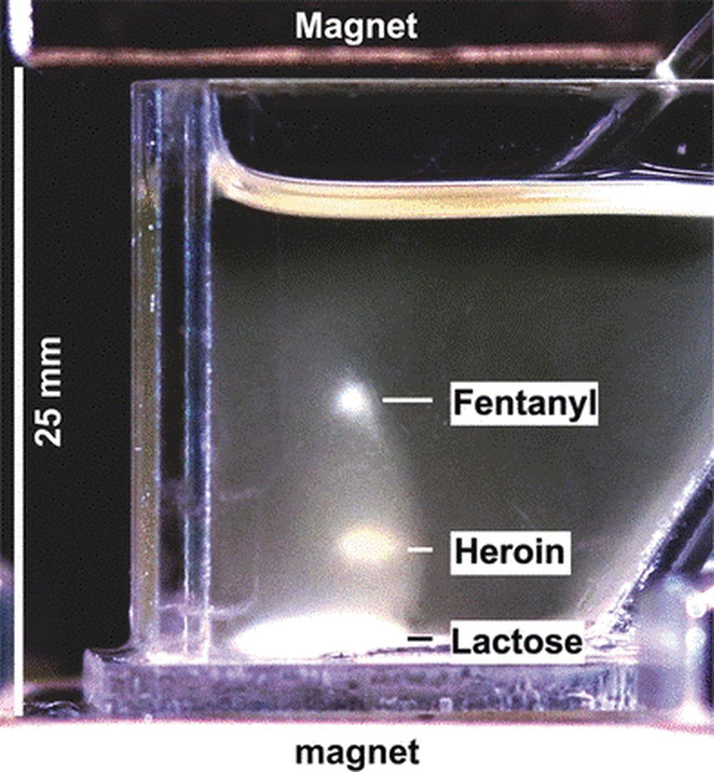 Das MagLev-Analysegerät besteht aus zwei starken Permanentmagneten auf beiden Seiten einer Küvette, die mit einer Lösung aus einem paramagnetischen Gadolinium-Chelatkomplex gefüllt ist. (Gadolinium ist ein magnetisches Metall, dessen freie Ionen toxisch sind. Komplexiert wie hier gilt es aber als ungiftig.) Sobald sich in der Küvette eine Pulverprobe befindet, beginnen die einzelnen Komponenten im Pulvergemisch durch das starke Magnetfeld zu „schweben”: Sie wandern in der Küvette aufwärts und sammeln sich an einer bestimmten Höhe an. Auf diese Weise konnten die Wissenschaftler homogen aussehende Pulvergemische in bis zu sieben Fraktionen auftrennen, die nahezu nur Reinsubstanzen mit ihrer jeweils charakteristischen Dichte enthielten. Unter den getesteten Substanzen waren Fenantyl, Kokain, Heroin, Lidocain, Koffein und Methamphetamin sowie verschiedene Streckmittel.