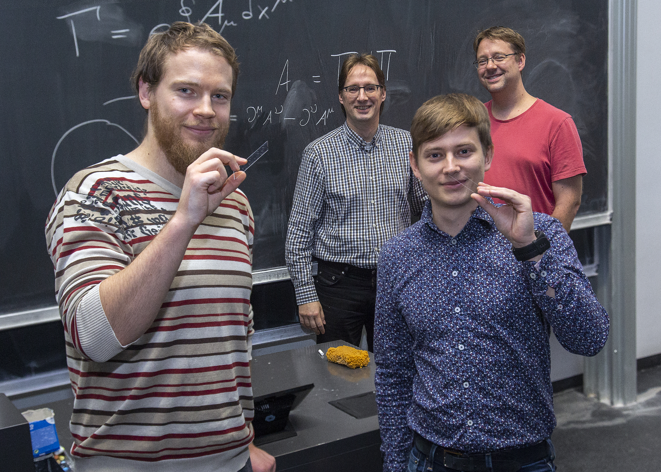 Bildunterschrift: (v.l.) Lucas Teuber und Mark Kremer präsentieren stolz die Glasplatten mit den eingavierten Wellenleitern. Im Hintergrund (v.l.) Professor Stefan Scheel und Professor Alexander Szameit vor der Tafel mit den theoretischen Grundgleichungen (Foto: Universität Rostock / ITMZ).