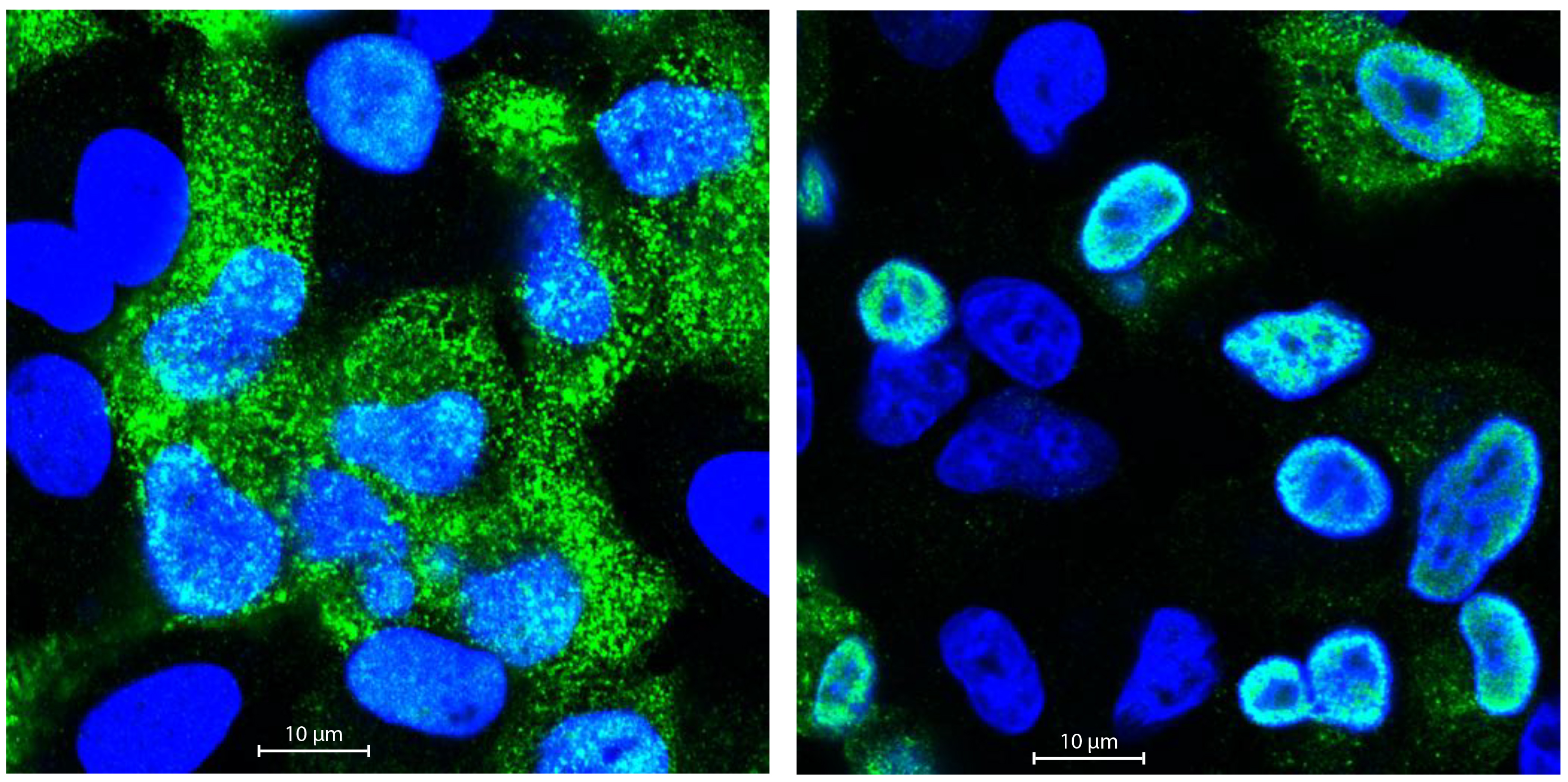 Fluoreszenzmikroskopische Untersuchungen bestätigten den Verdacht: Das Erbgut des Vogelgrippevirus schaffte es viel schlechter, aus dem Zellkern auszubrechen als die RNA des humanen Grippevirus. Aber warum? Gemeinsam mit der Sequenzierplattform des MDC und Professorin Irmtraud Meyer entdeckten sie einen kleinen Abschnitt in der Viren-RNA des Vogelgrippevirus, der alternatives Spleißen beeinflusst. „Wir nennen das ein cis-regulatorisches Element“, sagt Bogdanow. „Alternatives Spleißen regelt nämlich, welche Proteine schlussendlich aus einem Gen gemacht werden, denn viele Gene kodieren für mehr als ein Protein. Wenn menschliche Zellen von Vogelgrippe befallen werden, sorgt dieses Element dafür, dass mehr M2- statt M1-Protein hergestellt wird.“