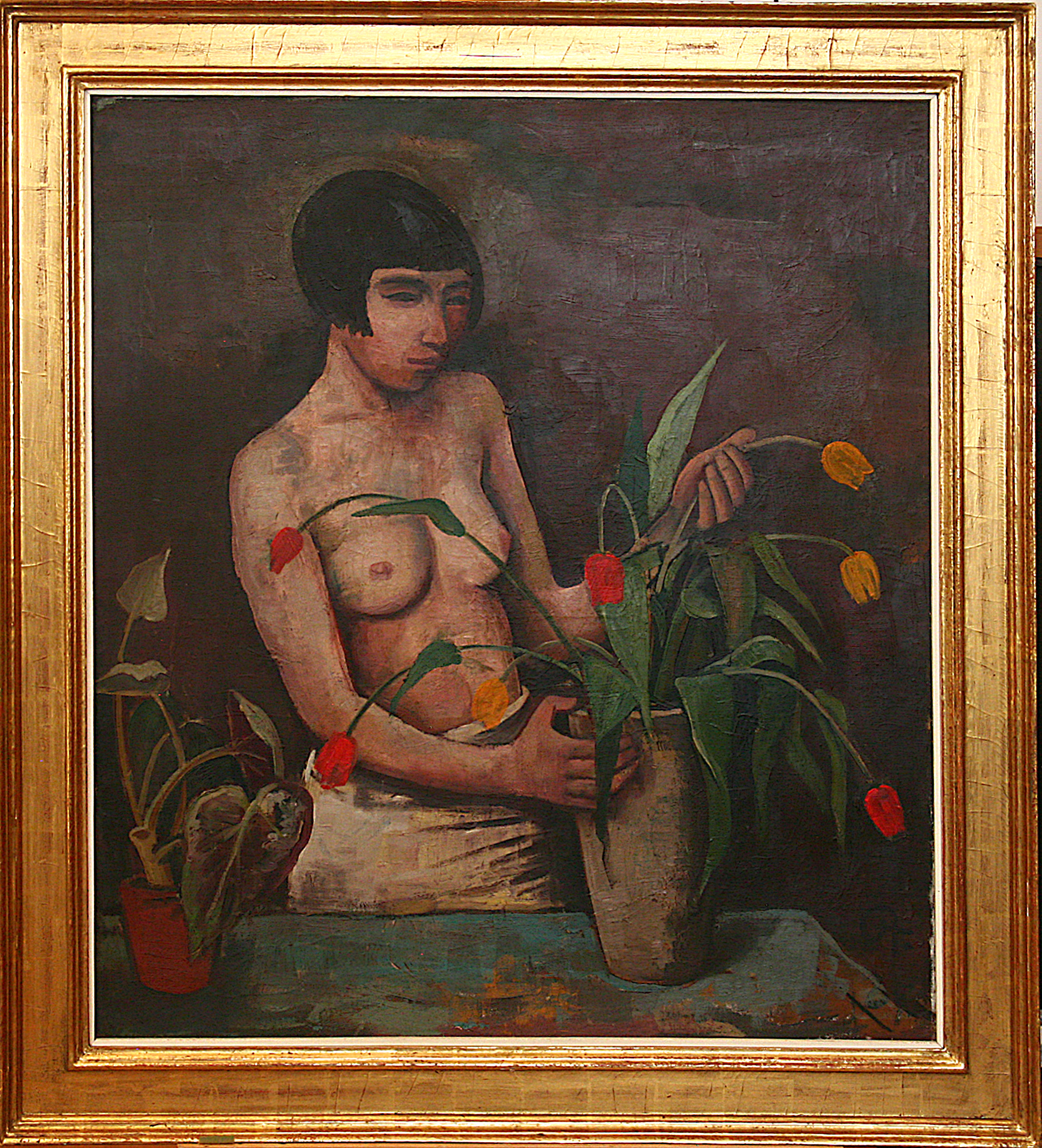 Ein privater Spender hat das Gemälde „Junge Frau mit Tulpenvase“ von Karl Hofer (1878–1958) gestiftet. Es ist um 1924/25 datiert, dies gilt als die qualitativ beste Phase im Schaffen dieses herausragenden Vertreters der deutschen Malerei zwischen den beiden Weltkriegen. Ein bestimmtes Motiv weist unverkennbar in die mittleren 1920-iger Jahre: Die weibliche Figur – es ist Hofers Modell Martha – trägt einen modischen Bubikopf. Das 106 Zentimeter hohe und 90 Zentimeter breite Gemälde ist erst einmal öffentlich gezeigt worden, 2012 im Rahmen einer Karl-Hofer-Werkschau der Kunsthalle Emden.