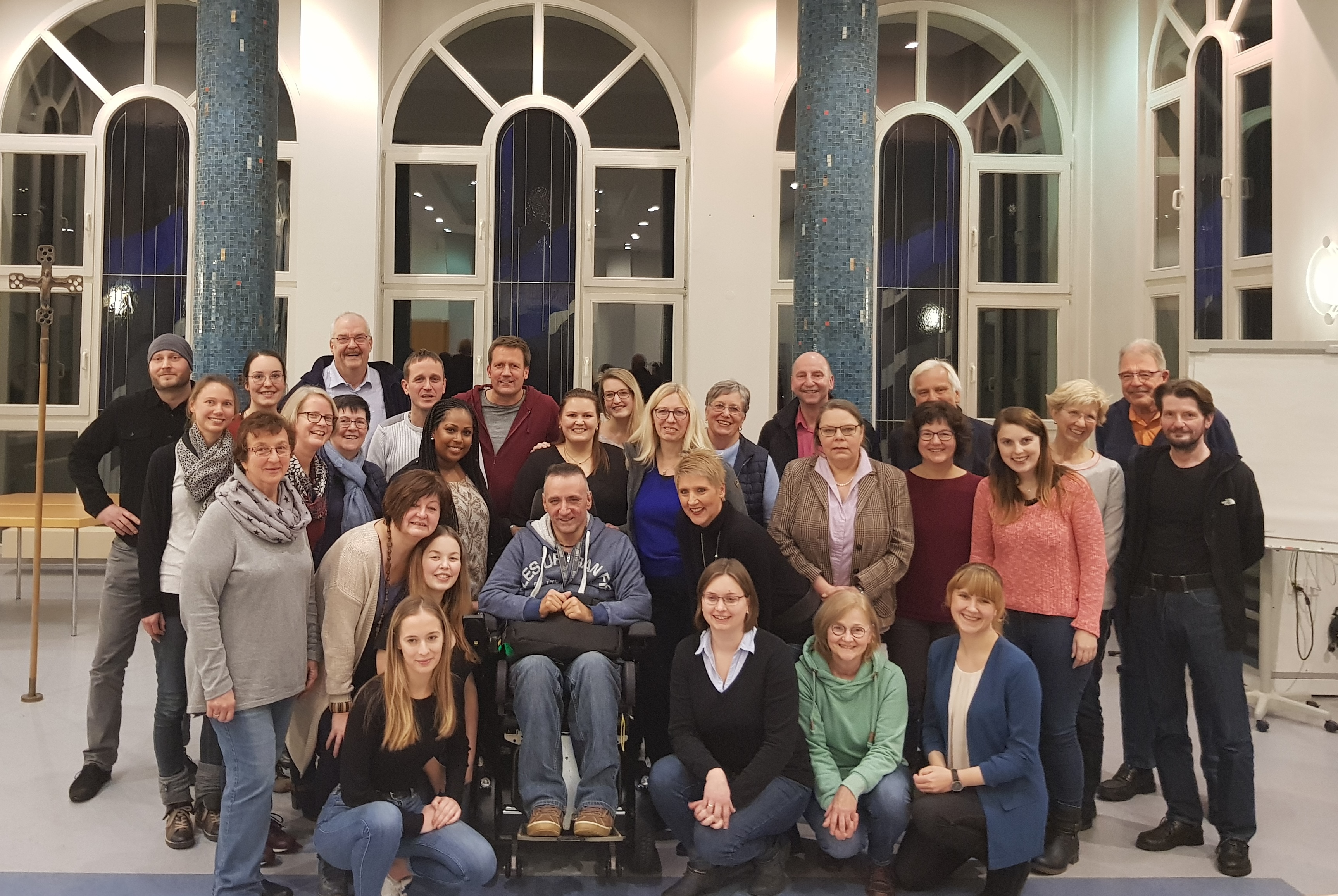 Sängerinnen und Sänger von Sacropops Waldalgesheim und die Solistin Menna Mulugeta haben gemeinsam mit Chorleiter Peter Schnur am Flügel Joachim Albrecht vor Studierenden der PTHV im Richard-Henkes-Saal einen Glücksmoment beschert.