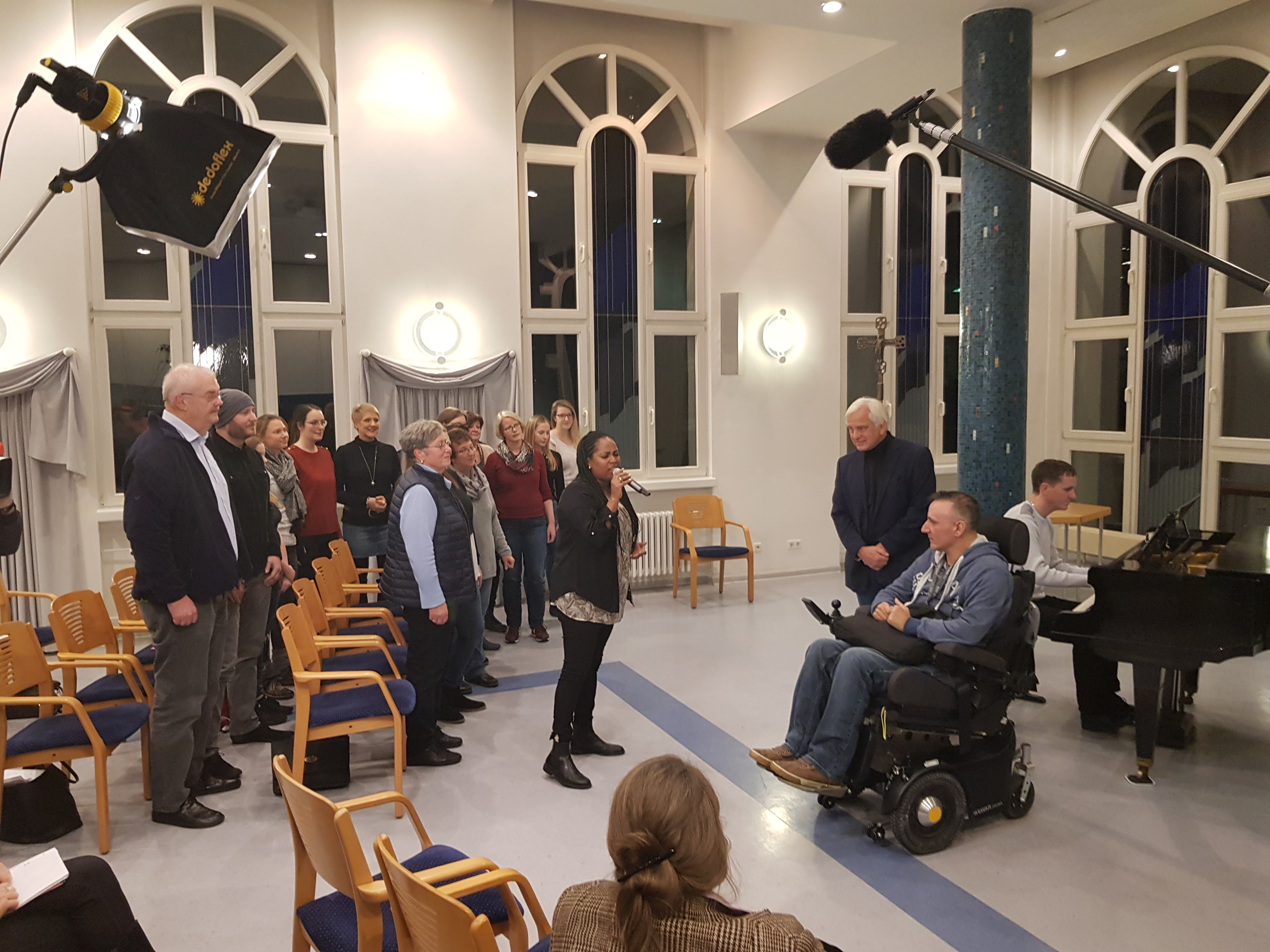 In seinem Vortrag betonte er: „Das Ziel ist es, so viele schöne Momente wie möglich zu schaffen. Ich habe schöne Momente.“ Und einen solchen hat er vor der laufenden Kamera im Richard-Henkes-Saal der PTHV erleben dürfen: Während seines Vortrages vor den Studierenden wurde er mit seinem Lieblingslied „Wie schön Du bist“ (Sarah Connor) überrascht. Eine Gruppe Sängerinnen und Sänger von Sacropops Waldalgesheim und die Solistin Menna Mulugeta haben, begleitet von Chorleiter Peter Schnur am Flügel,für ihn zwei Mal den Song live gesungen. Hier der Link zur Sendung in der Mediathek des SWR: https://www.swrfernsehen.de/landesschau-rp/Gluecksmomente-in-Vallendar-Trotz-Rollstuhl-grosse-Hilfe-bei-Schicksalsschlaegen,av-o1181827-100.html