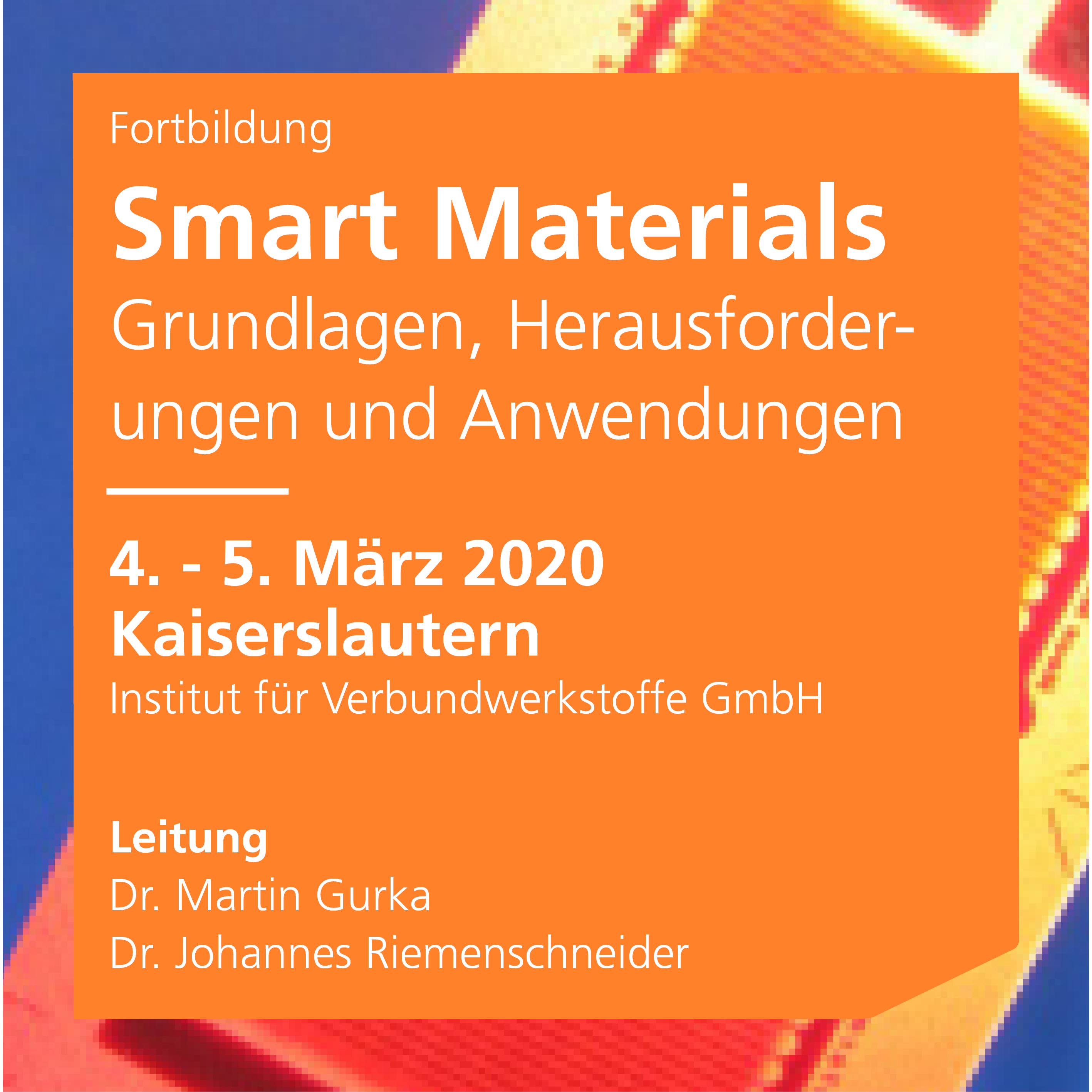 Die Fortbildung steht unter der fachlichen Leitung von Dr. Martin Gurka, Institut für Verbundwerkstoffe GmbH (IVW) und Dr.-Ing. Johannes Riemenschneider, Deutsches Zentrum für Luft- und Raumfahrt e.V. (DLR).