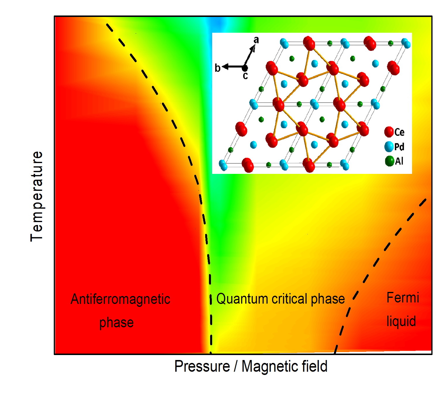 Temperature pressure/magnetic field phase diagram for the CePdAl compound. The colour cod-ing indicates the temperature behaviour of the electrical resistance. The metal behaves as ex-pected wihtin the red marked regions, while deviation from theory becomes from yellow through green towards blue more and more pronounced. The main result is the existence of a quantum critical phase (centre). The atomic structure of the CdPdAl crystal (above) may be re-sponsible for its stabilisation.