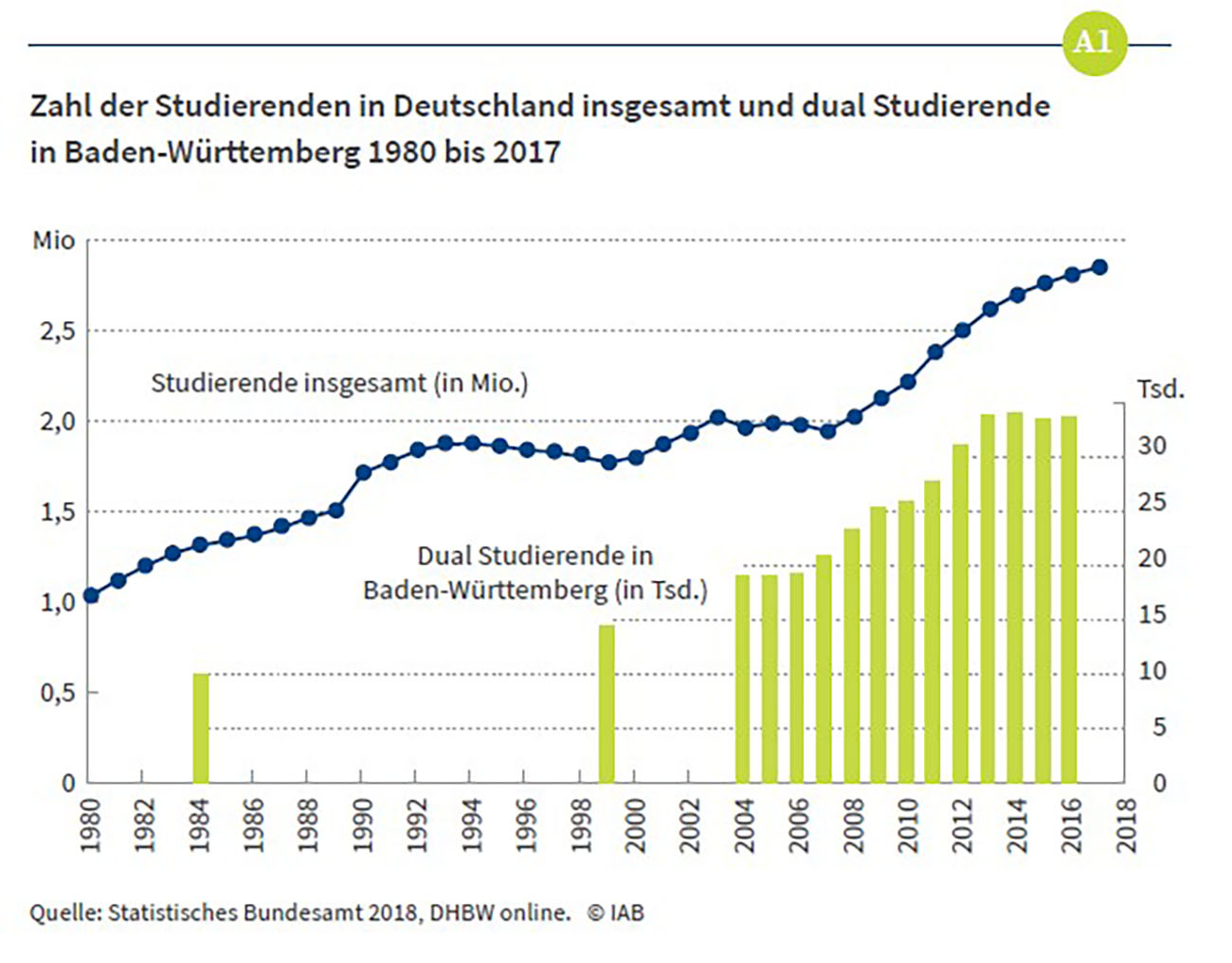Rund vier Prozent aller Studierenden absolvieren ein duales Studium. Die Zahl dual Studierender stieg in den letzten 15 Jahren von 40.000 auf mehr als 100.000. Im gleichen Zeitraum erhöhte sich die Zahl der Kooperationsunternehmen von weniger als 20.000 auf rund 50.000.