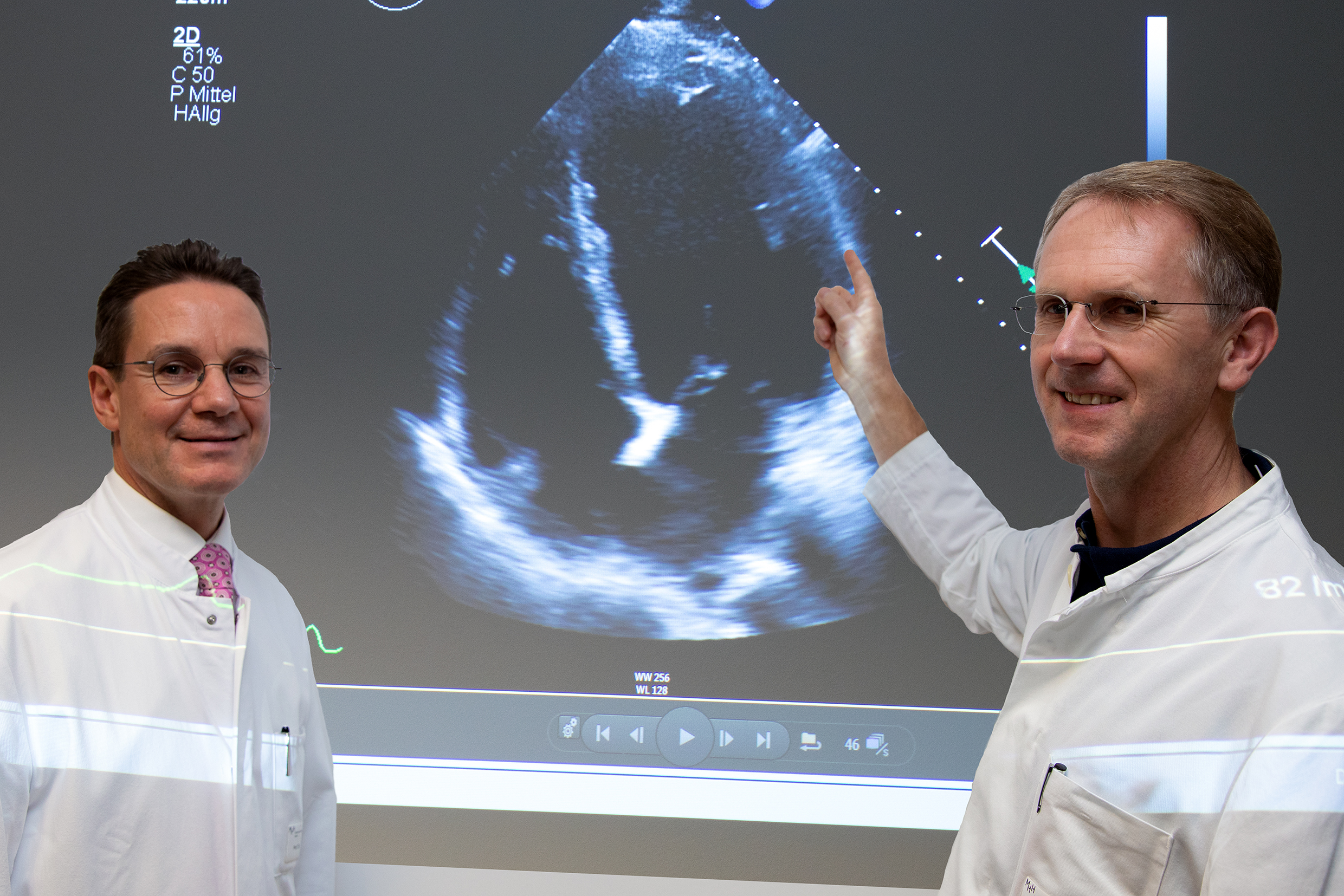Ein Foto ist beigefügt. Es zeigt Professor Dr. Johann Bauersachs (links) und Professor Dr. Udo Bavendiek vor einem vergrößerten Ultraschallbild des Herzmuskels. Sie können es kostenfrei nutzen, wenn Sie als Quelle „MHH / Karin Kaiser“ angeben.