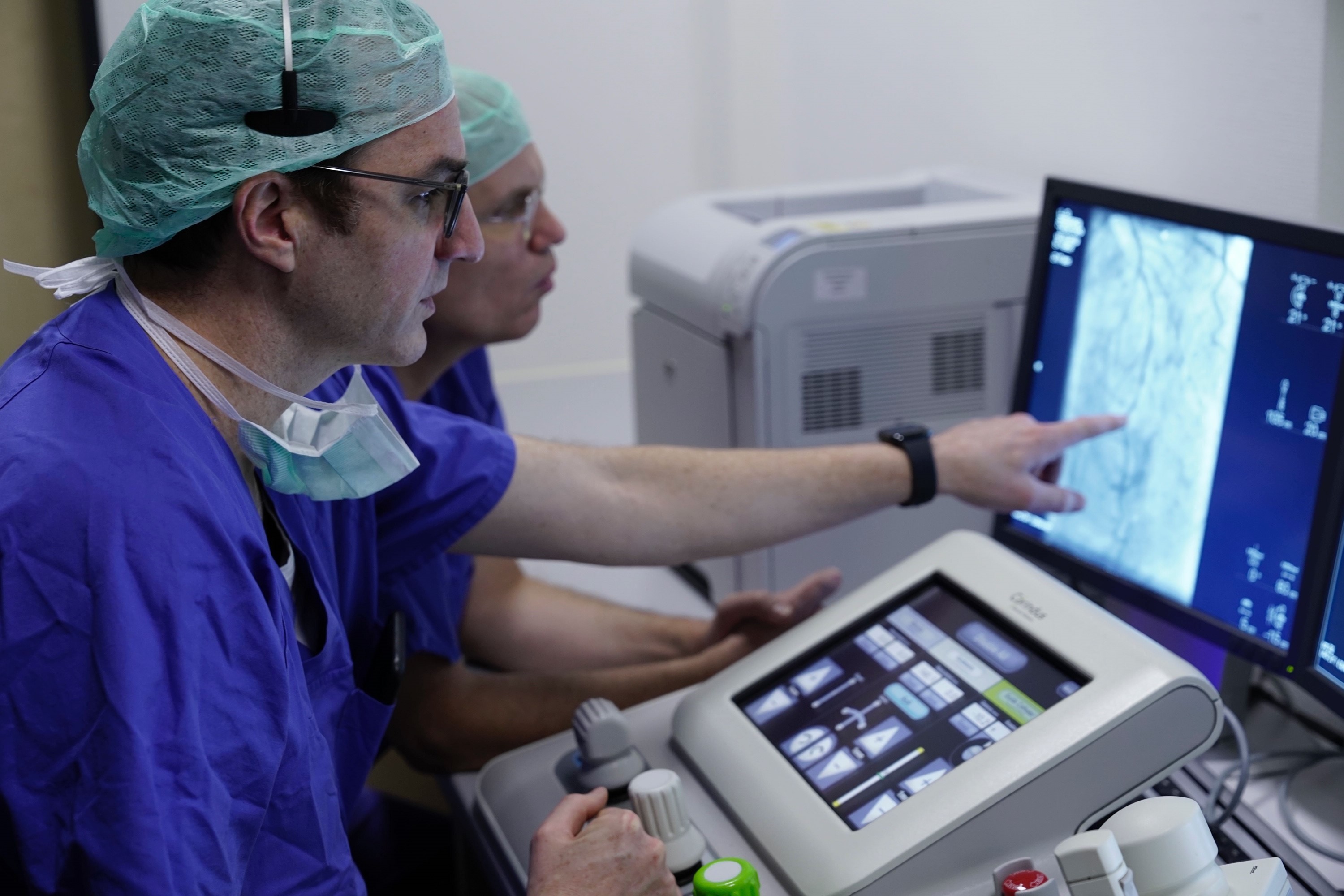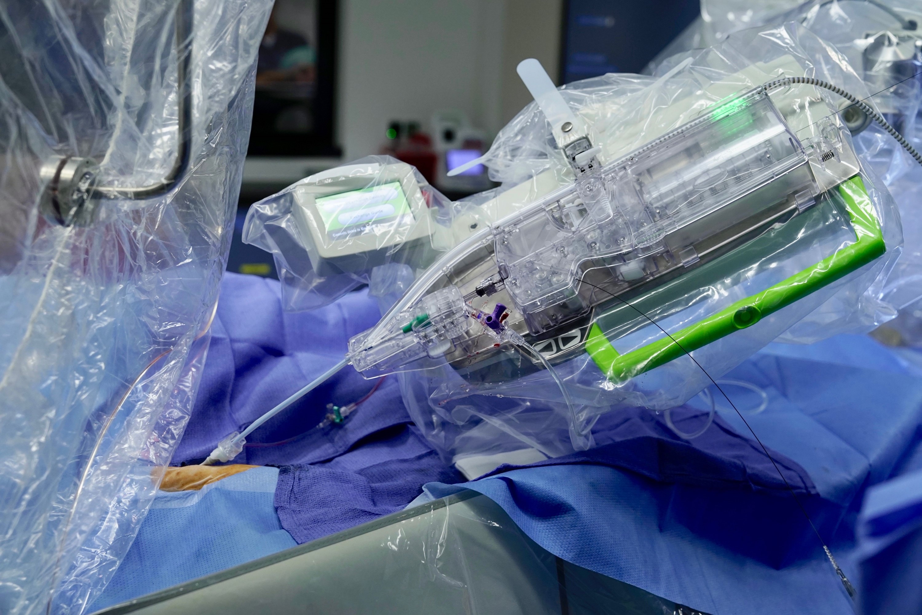 Um den Katheter zu führen und den Stent zu setzen, nutzen die Ärzte ein endovaskuläres Robotersystem zusammen mit einem Angiographie-System. Das Angiographie-System lieferte den Ärzten während des gesamten Eingriffs die Bildgebung zur Darstellung der Gefäße des Patienten, durch die der Katheter geführt wurde.