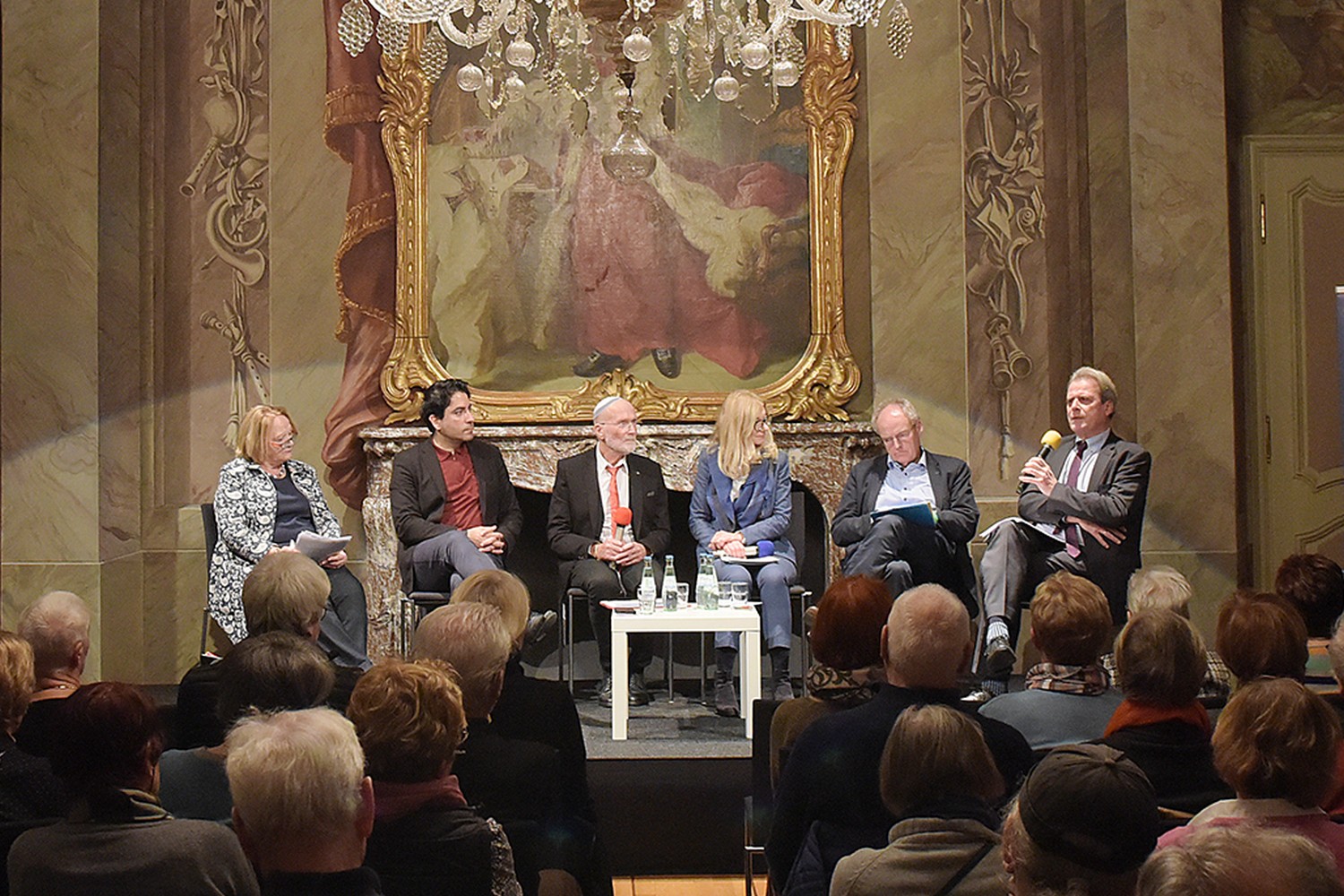 Der katholische Theologe und Kirchenhistoriker Prof. Dr. Hubert Wolf und der evangelische Theologe und Sozialethiker Prof. Dr. Arnulf von Scheliha legten anhand historischer Fallbeispiele und religiöser Textstellen dar, wie und warum sich der Antisemitismus in den christlichen Kirchen gehalten habe. Hinter ihnen liege eine lange „Lerngeschichte“, in der auch innerkirchlich viel gerungen worden sei. Das gelte es weiter aufzuarbeiten. Beide Forscher zeigten sich überzeugt, dass die kritische Auseinandersetzung der Kirchen mit ihrer Antisemitismus-Geschichte zur Überwindung des heutigen Antisemitismus beitragen könne. Hubert Wolf hob die Bedeutung der öffentlichen Vermittlung theologischer Erkenntnisse hervor. Religionen könnten nur zu gegenseitigem Verständnis gelangen, wenn sie genug übereinander wüssten.