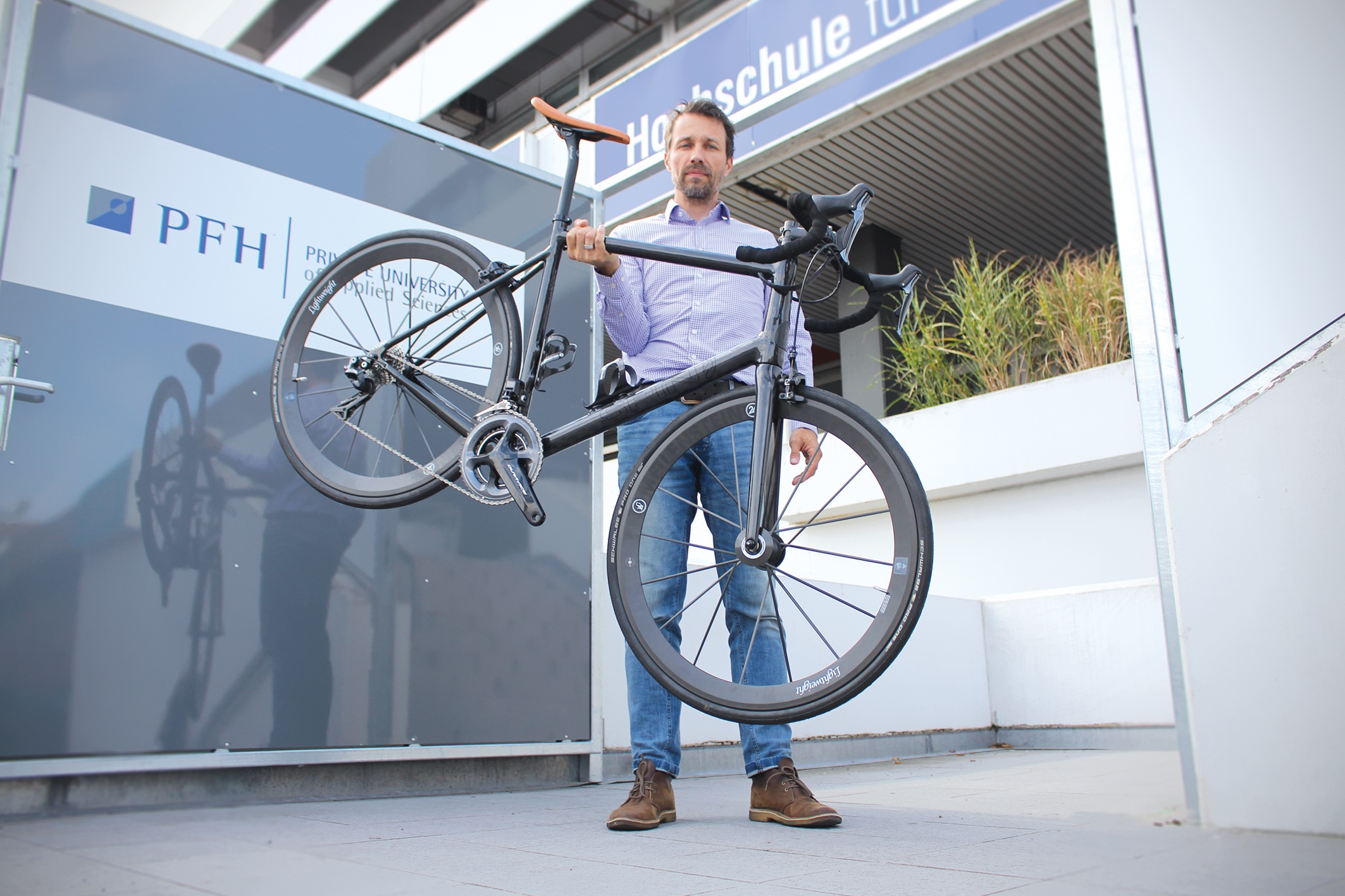 Nur rund acht Kilogramm wiegt das Rennrad mit Elektromotor, das Prof. Dr.-Ing. Marc Siebert mit einer Hand locker in der Luft hält. Nach aktuellem Kenntnisstand ist es sogar das weltweit leichteste E-Bike, bei dem Akku und Antriebstechnik in den Rahmen integriert, also quasi unsichtbar sind. Siebert ist Professor für Faserverbundwerkstoff-Technologie am Hansecampus Stade der PFH Private Hochschule Göttingen und hat es konstruiert.