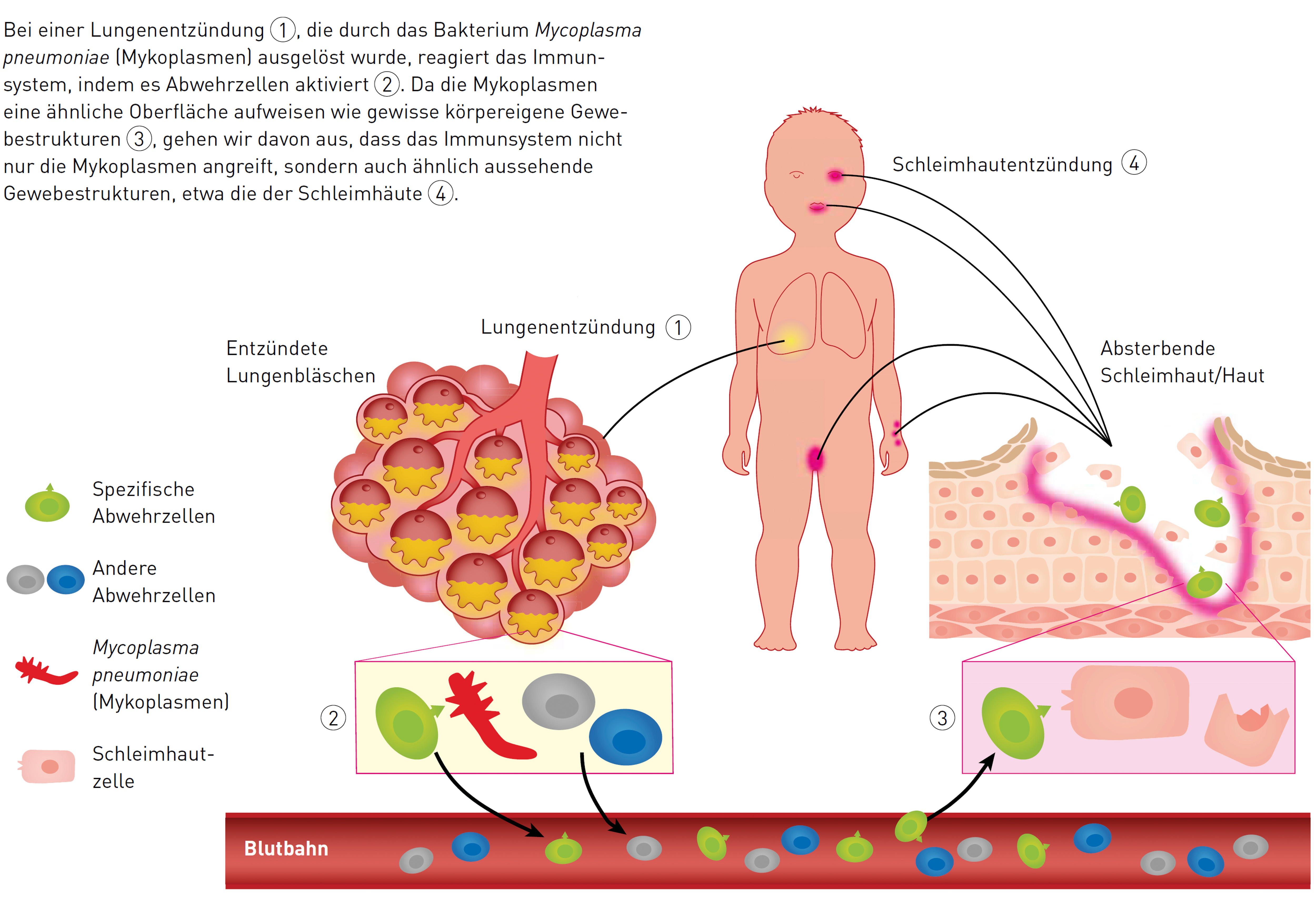 Aktuell erforscht das Team am Kinderspital, welche Komponenten diese Immunreaktion auslösen und welche Strukturen der Haut und der Schleimhaut angegriffen werden. Frühere Studien zeig-ten, dass die Oberfläche der Mykoplasmen eine grosse Ähnlichkeit mit körpereigenen Strukturen verschiedener Gewebe haben können. Daher wird vermutet, dass sich das Immunsystem sowohl gegen die Mykoplasmen als auch gegen die ähnlichen, körpereigenen Strukturen richtet, weil es die beiden nicht auseinanderhalten kann.