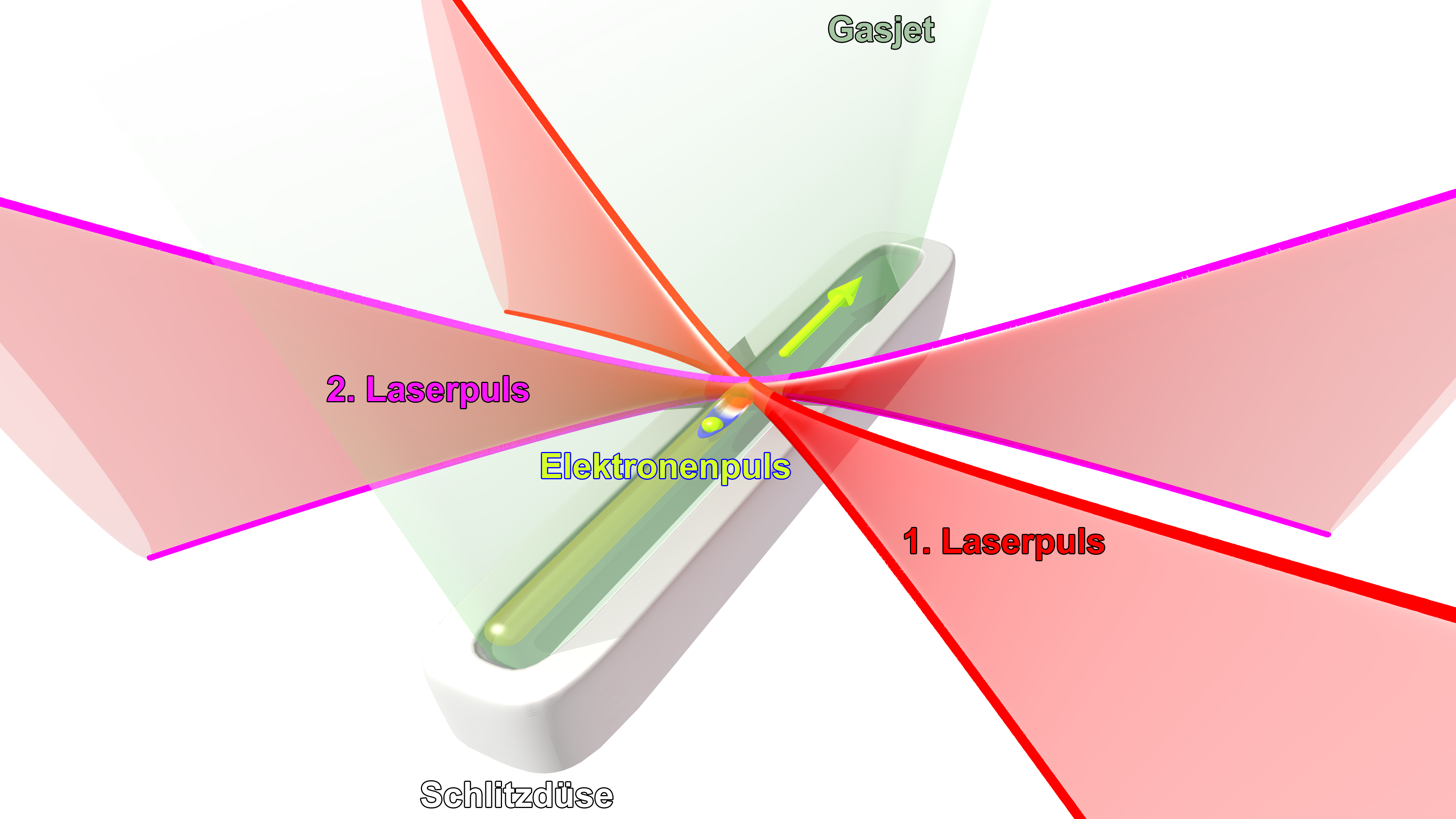 „Wir heben die Naturgesetze natürlich nicht auf“, schränkt der Physiker ein. „Aber wir schlagen einen anderen Aufbau für die Beschleuniger vor, bei dem die bisher limitierenden Gesetzmäßigkeiten keine Rolle mehr spielen.“ Dieser Aufbau basiert auf einer komplexen, präzise ausgefeilten Geometrie: Zwei hochintensive Laserpulse werden von seitlich außen auf ein Gas – das Beschleunigermedium – gerichtet. Während dabei die Laserpulse zylindrisch fokussiert sein müssen, sind die Fronten der Laserpulse in einem bestimmten Winkel verkippt, damit der Kreuzungspunkt beider Laserpulse im Plasma sich mit Vakuum-Lichtgeschwindigkeit entlang der Beschleunigungsstrecke vorwärtsbewegt.