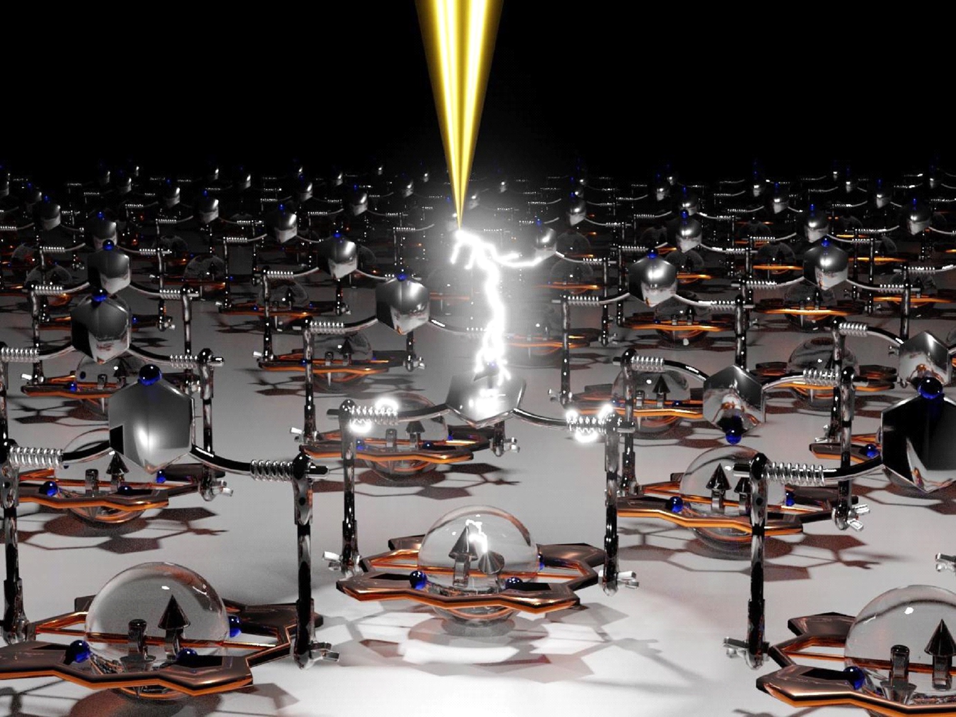 Caption: The new molecule has three properties. Only two combinations of these properties are stable. Switched between the different states is achieved by applying tiny tunneling currents.