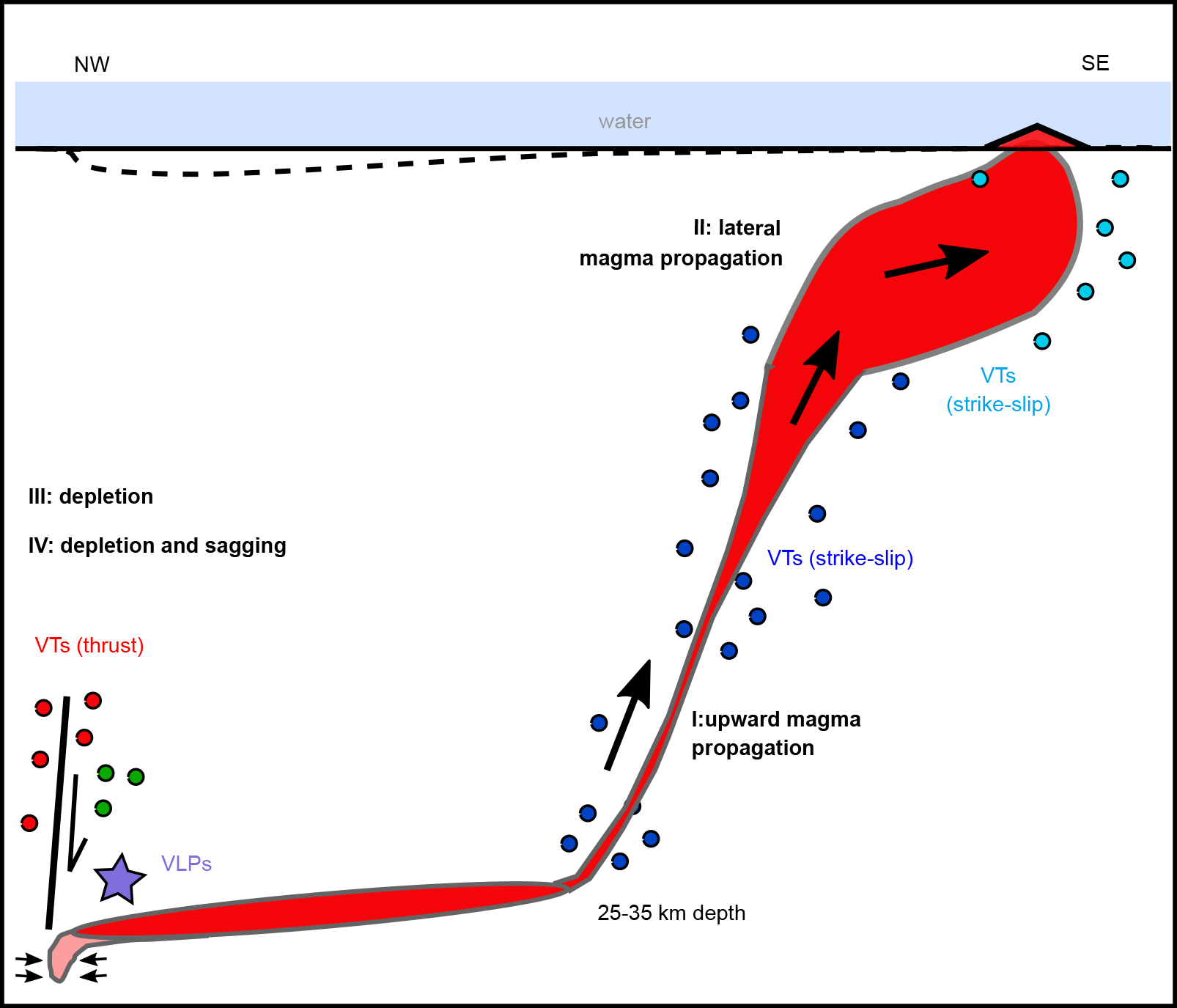 Obwohl sich im Epizentrum der seismischen Aktivität keine Hinweise auf früheren Vulkanismus ergaben, hatten die Wissenschaftler des GFZ von Anfang an magmatische Prozesse vermutet, da Bebenschwärme in der oberen Erdkruste oft als Reaktion auf den Aufstieg von Magma entstehen und VLPs in früheren Jahren im Zusammenhang mit dem Kollaps von großen Caldera-Vulkanen einhergingen. Der spezielle Frequenzgehalt der VLP Signale entsteht dabei durch die Resonanzschwingung der vergrabenen Magmakammer. Je tiefer die Schwingungen sind, desto größer ist das Magmareservoir. Allerdings lagen die Bebenschwärme unter dem Ozeanboden viel tiefer als bei anderen Vulkanen und die Resonanztöne der VLPs waren ungewöhnlich tief und stark.