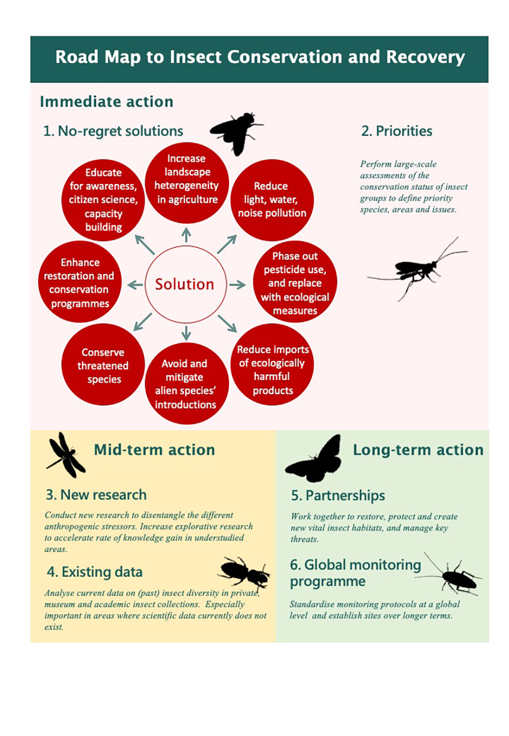 Mittelfristig sollten, laut des Aktionsplans, neue wissenschaftliche Studien durchgeführt werden, um im Detail zu klären, welche Stressfaktoren sich wie stark auf die Insektenwelt auswirken. Parallel sollen bestehende Insekten-Archive, beispielsweise in Museen oder in wissenschaftlichen Sammlungen, durchsucht werden, um bisherige Wissenslücken schließen zu können.