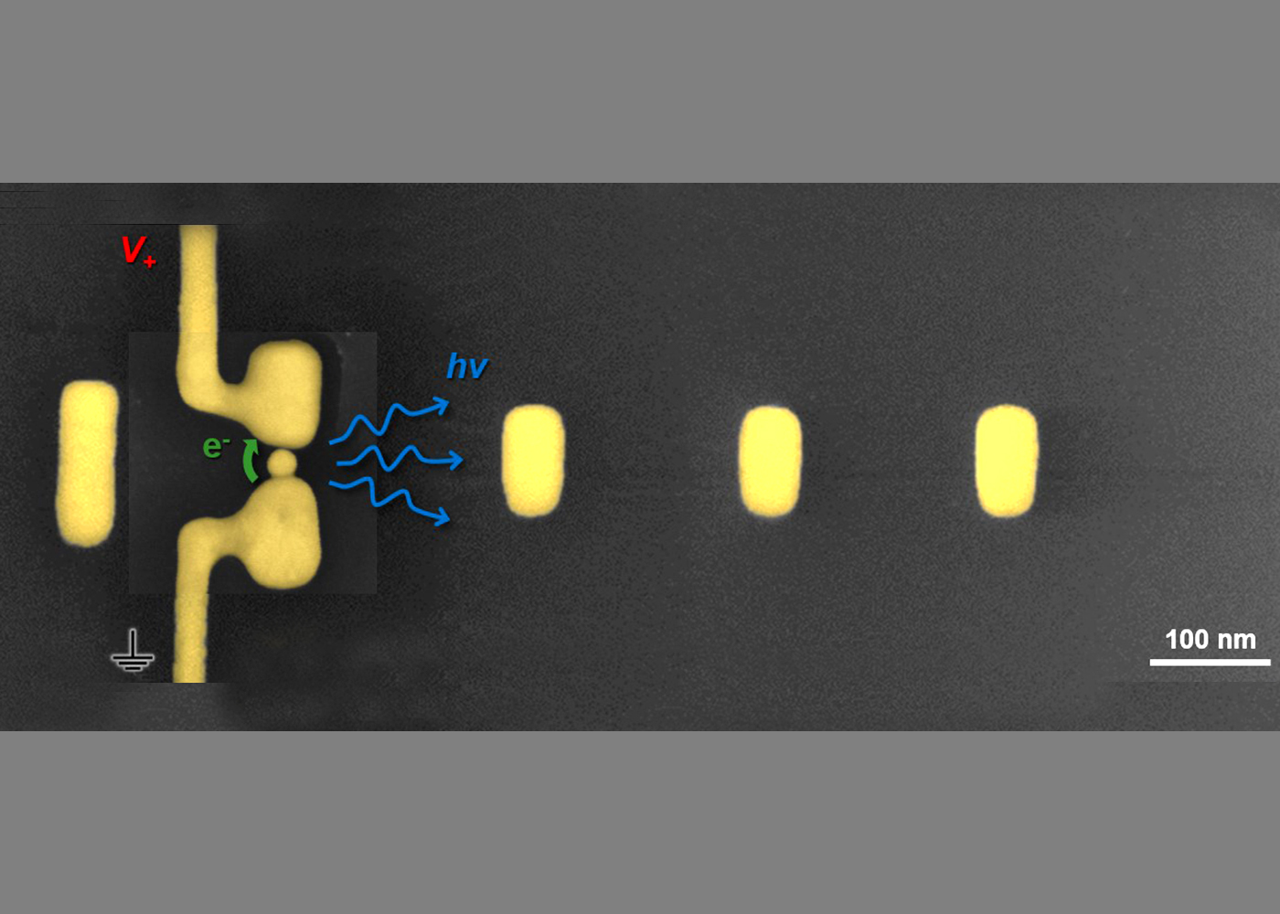 In a next step, the physicists positioned a gold nano particle in the active element so that it touches one wire of the active element while keeping a distance of only one nanometre to the other wire. "This gap is so narrow that electrons can cross it when voltage is applied using a process known as quantum tunnelling," explains Kullock. This charge motion generates vibrations with optical frequencies in the antenna which are emitted in a specific direction thanks to the special arrangement of the reflectors and directors.