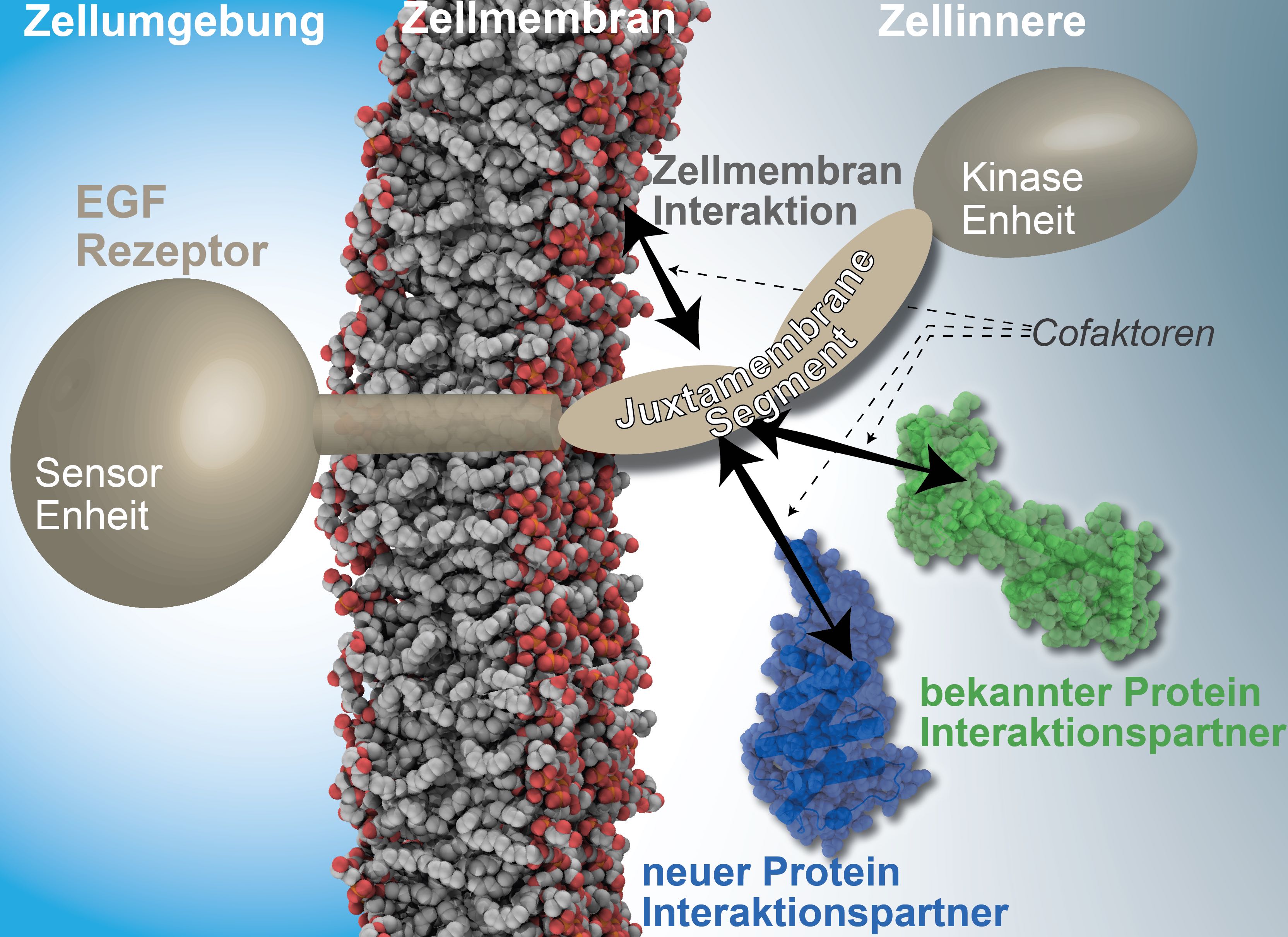 Das Zellwachstum wird unter anderem durch Proteine in der Zellmembran gesteuert. Sogenannte EGF-Rezeptoren (EGF steht für Epidermal Growth Factor) bilden dabei eine zentrale Schnittstelle zwischen der Zelle und ihrer Umgebung. Deshalb sind Störungen in diesem System eine häufige Ursache für Krebserkrankungen, bei denen es zu einem fehlerhaft kontrollierten Zellwachstum kommt.