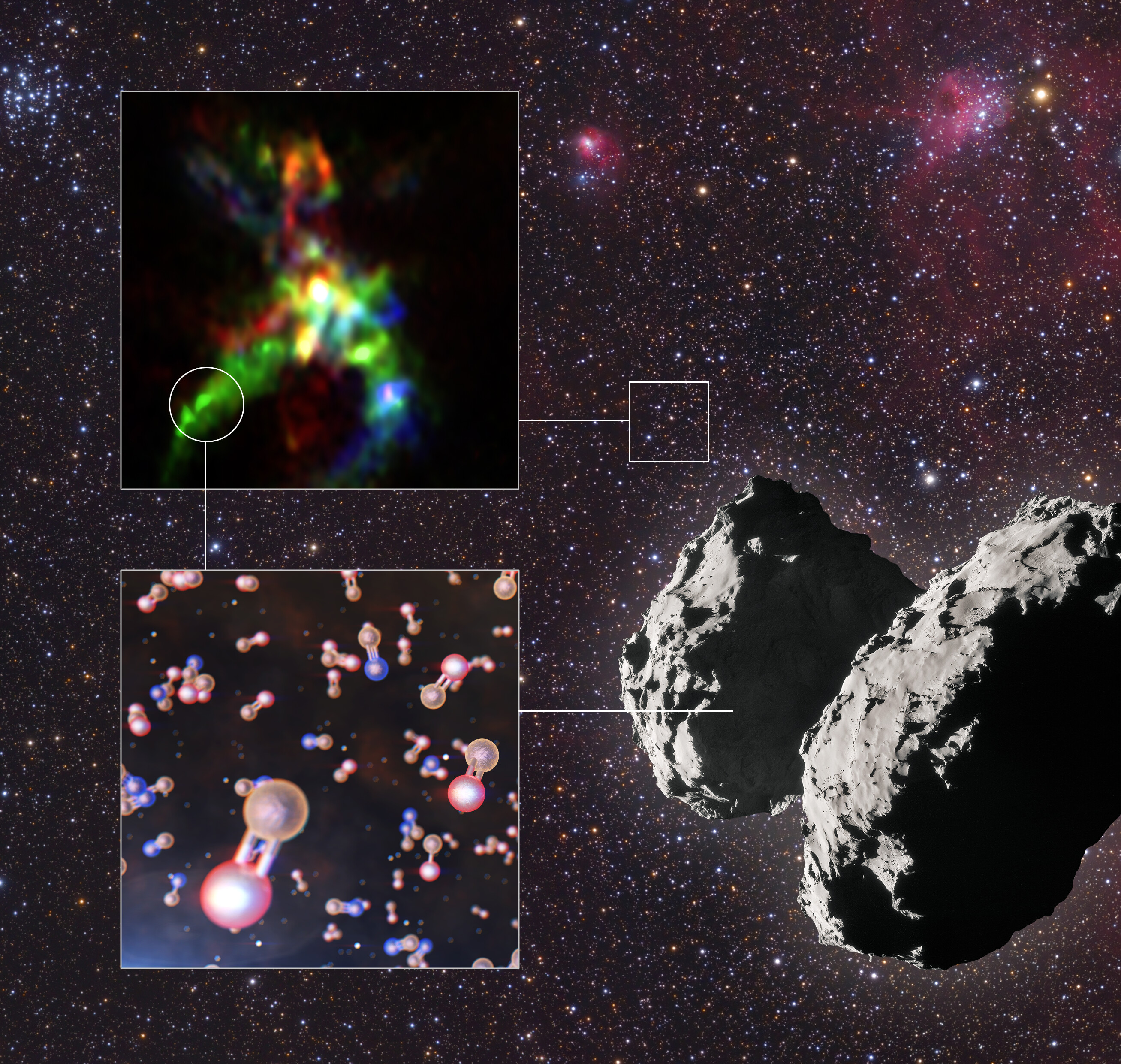 Das Team besteht aus V. M. Rivilla (INAF-Osservatorio Astrofisico di Arcetri, Florenz, Italien [INAF-OAA]), M. N. Drozdovskaya ( Center for Space and Habitability, Universität Bern, Schweiz [CSH]), K. Altwegg (Physikalisches Institut, Universität Bern, Schweiz), P. Caselli (Max-Planck-Institut für extraterrestrische Physik, Garching, Deutschland), M. T. Beltrán (INAF-OAA), F. Fontani (INAF-OAA), F.F.S. van der Tak (SRON Netherlands Institute for Space Research und Kapteyn Astronomical Institute, Universität Groningen, Niederlande), R. Cesaroni (INAF-OAA), A. Vasyunin (Föderale Universität Ural, Jekaterinburg, Russland, und Fachhochschule Ventspils, Lettland), M. Rubin (CSH), F. Lique (LOMC-UMR, CNRS-Université du Havre), S. Marinakis (University of East London und Queen Mary University of London, Großbritannien), L. Testi (INAF-OAA, ESO Garching und Exzellenzcluster "Universe", Deutschland) und das ROSINA-Team (H. Balsiger, J. J. Berthelier, J. De Keyser, B. Fiethe, S. A. Fuselier, S. Gasc, T. I. Gombosi, T. Sémon, C. -y. Tzou).
