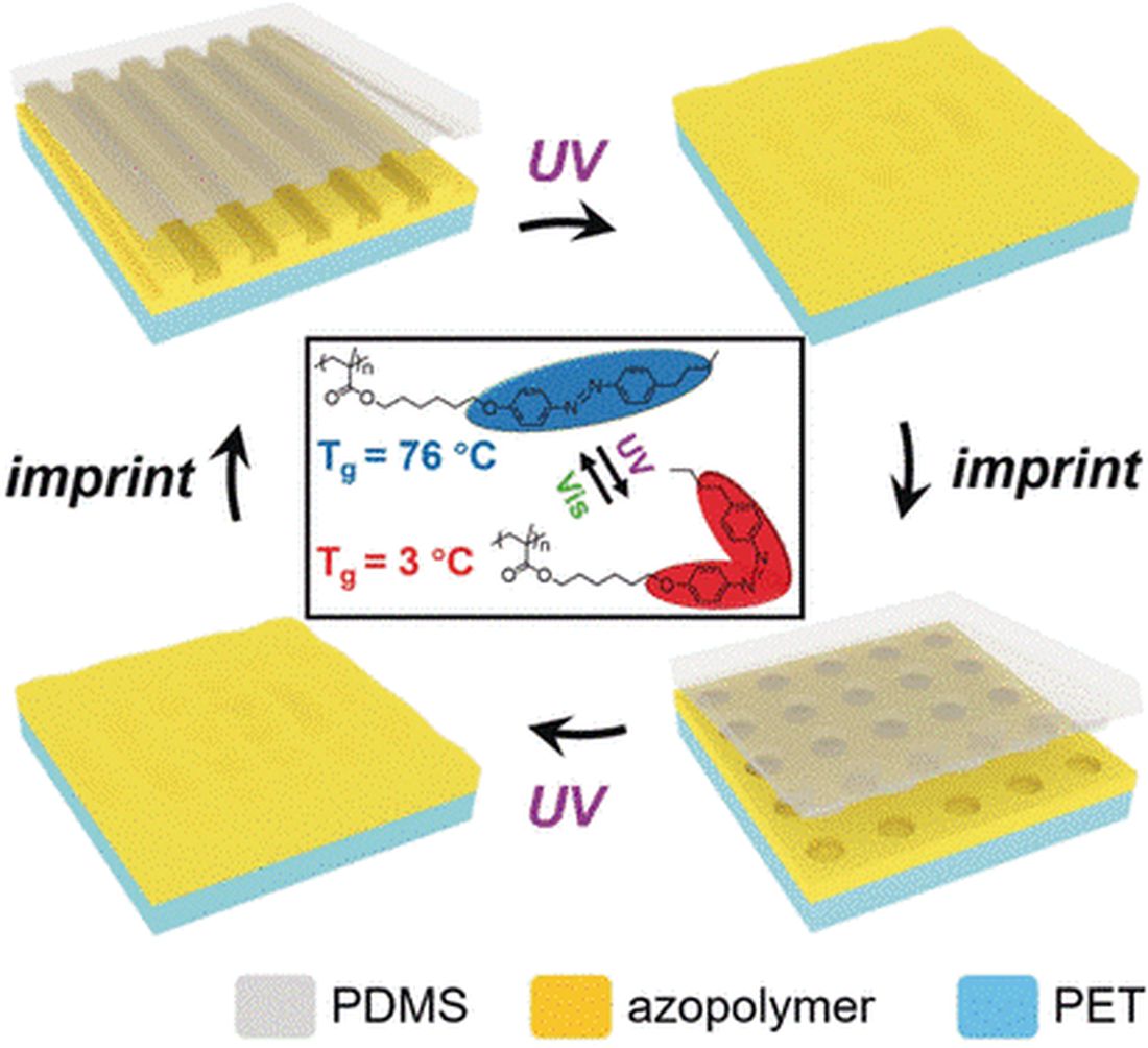 Um das Nanomuster zu prägen, verflüssigten die Autoren zunächst den auf eine biegsame Folie aufgebrachten Azopolymerlack durch UV-Licht-Bestrahlung. Dann drückten sie eine transparente, nanostrukturierte Silikonfolie auf die verflüssigten Bereiche und bestrahlten die Schichten mit sichtbarem Licht. Dadurch härtete das Azopolymer aus, und zwar in den angenommenen Nanostrukturen der Silikonfolie. Durch eine Maske bestrahlten die Wissenschaftler dann den gehärteten Lack mit UV-Licht, um die unbedeckten Bereiche erneut zu verflüssigen. Als letzten Prägeschritt drückten sie eine weitere Folie auf das Azopolymer und härteten die neu entstandene Prägung wieder durch sichtbares Licht aus. Diese Technik nannten sie „athermische Nanoimprint-Lithographie“ (AT-NIL), also Lithographie zur heizfreien Prägung von Nanostrukturen.
