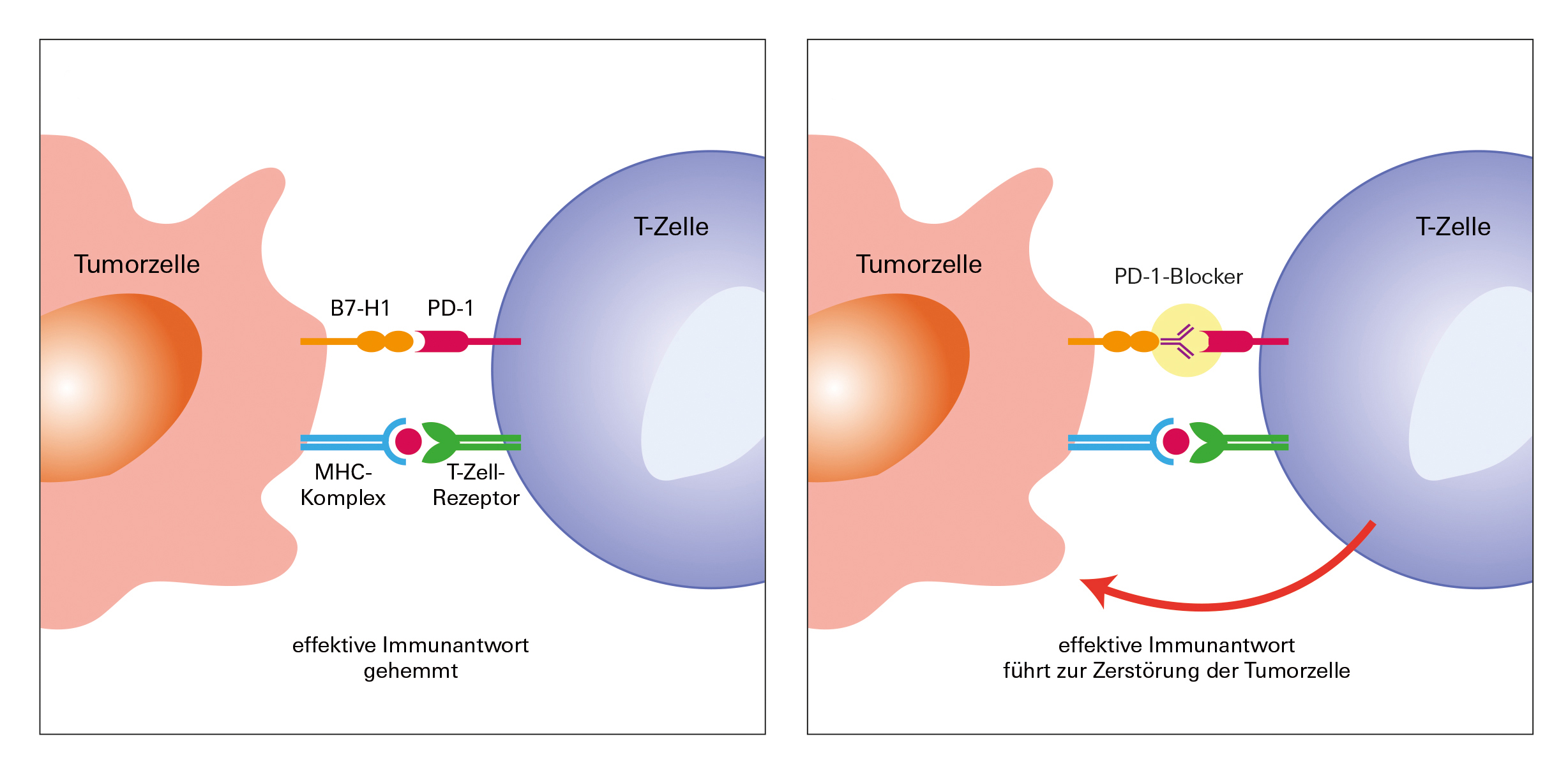 Manche Krebsarten produzieren ein Protein (PD-L1), das die körpereigenen Immunzellen daran hindert, den Krebs zu erkennen und effektiv zu bekämpfen. Immun-Checkpoint-Inhibitoren sind in der Lage, den PD-1-Rezeptor zu blockieren, so dass PD-L1 die Immunzellen nicht mehr behindert. Der Krebs ist damit für das Immunsystem sichtbar und kann angegriffen werden.